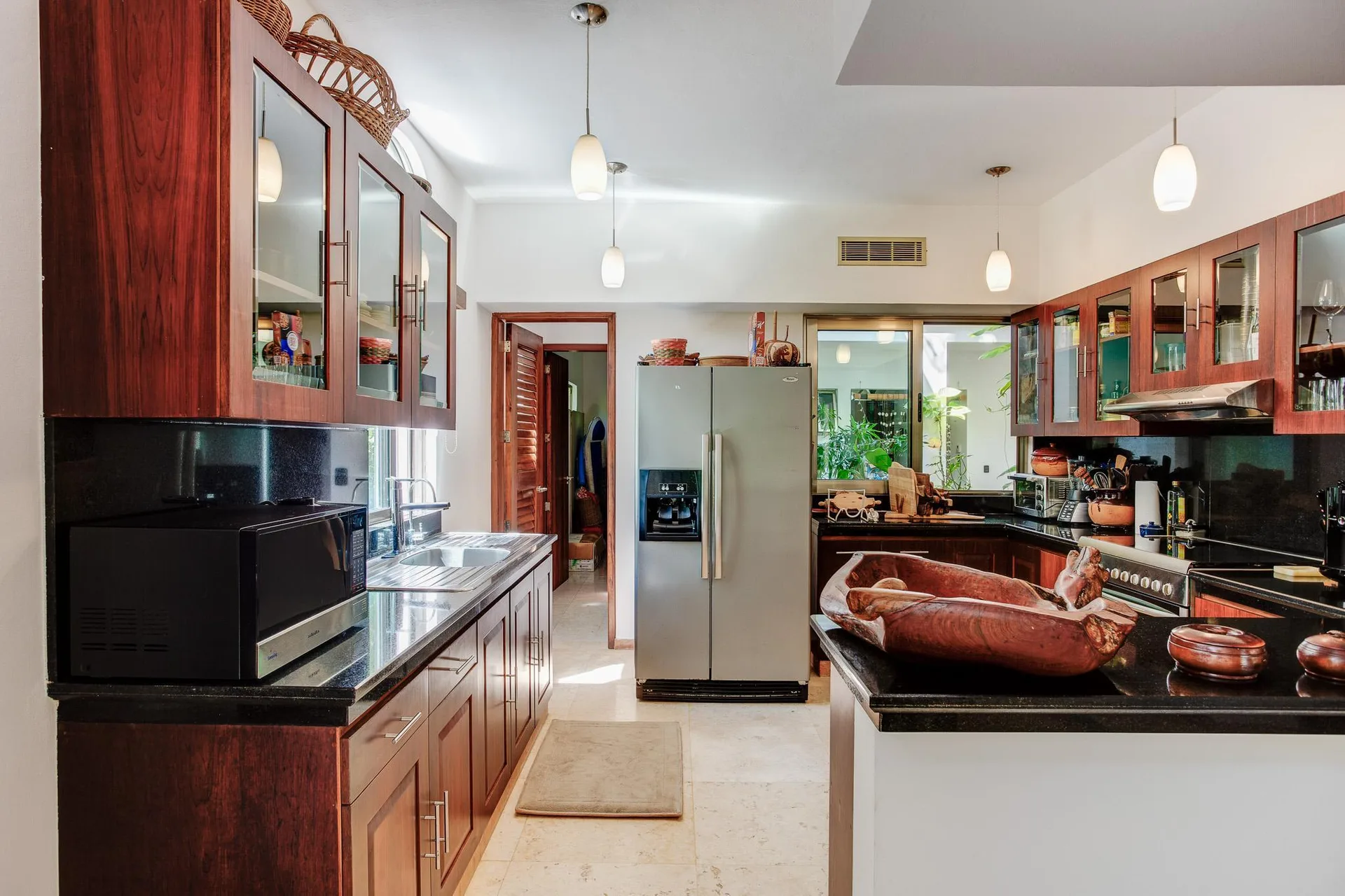 The residence includes four main bedroom suites and one service bedroom, accompanied by four full bathrooms and 1. 5 service bathrooms. The home offers direct views of Caleta Yalku and a private swimming pool. Construction features premium finishes including marble, granite, and tsalam wood.
