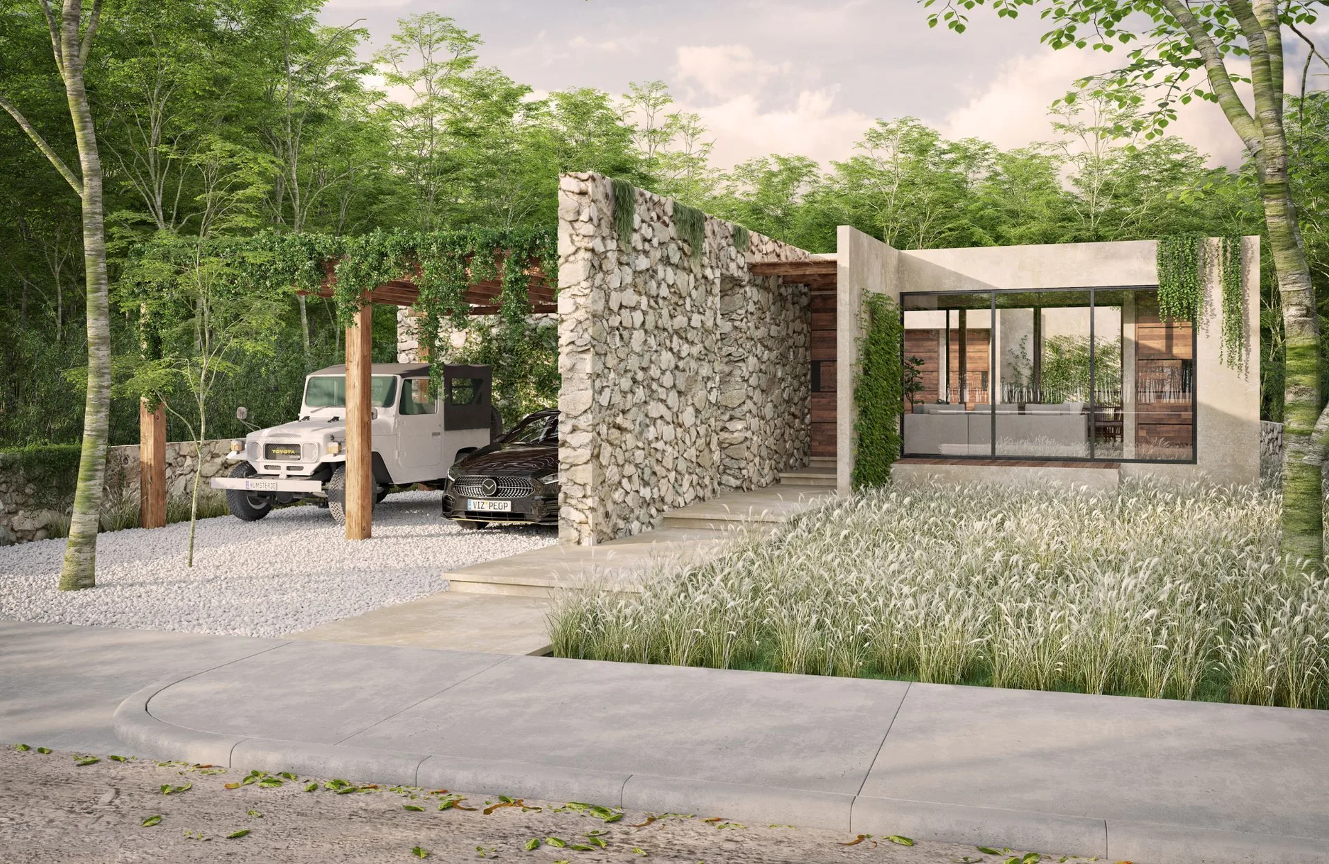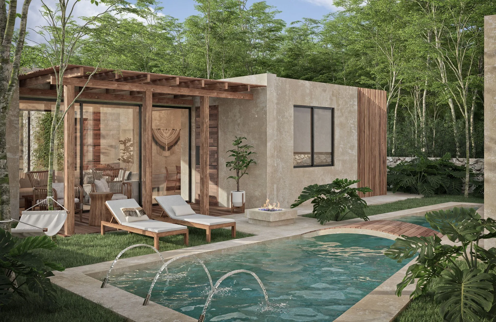The house is located in a gated community with cenotes in Xpu-ha, Quintana Roo. It is situated in an area between Playa del Carmen and Tulum, surrounded by nature.