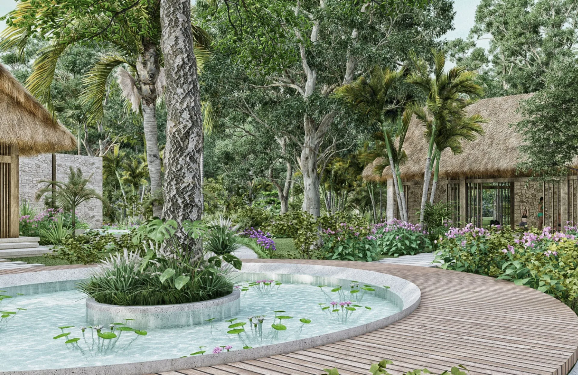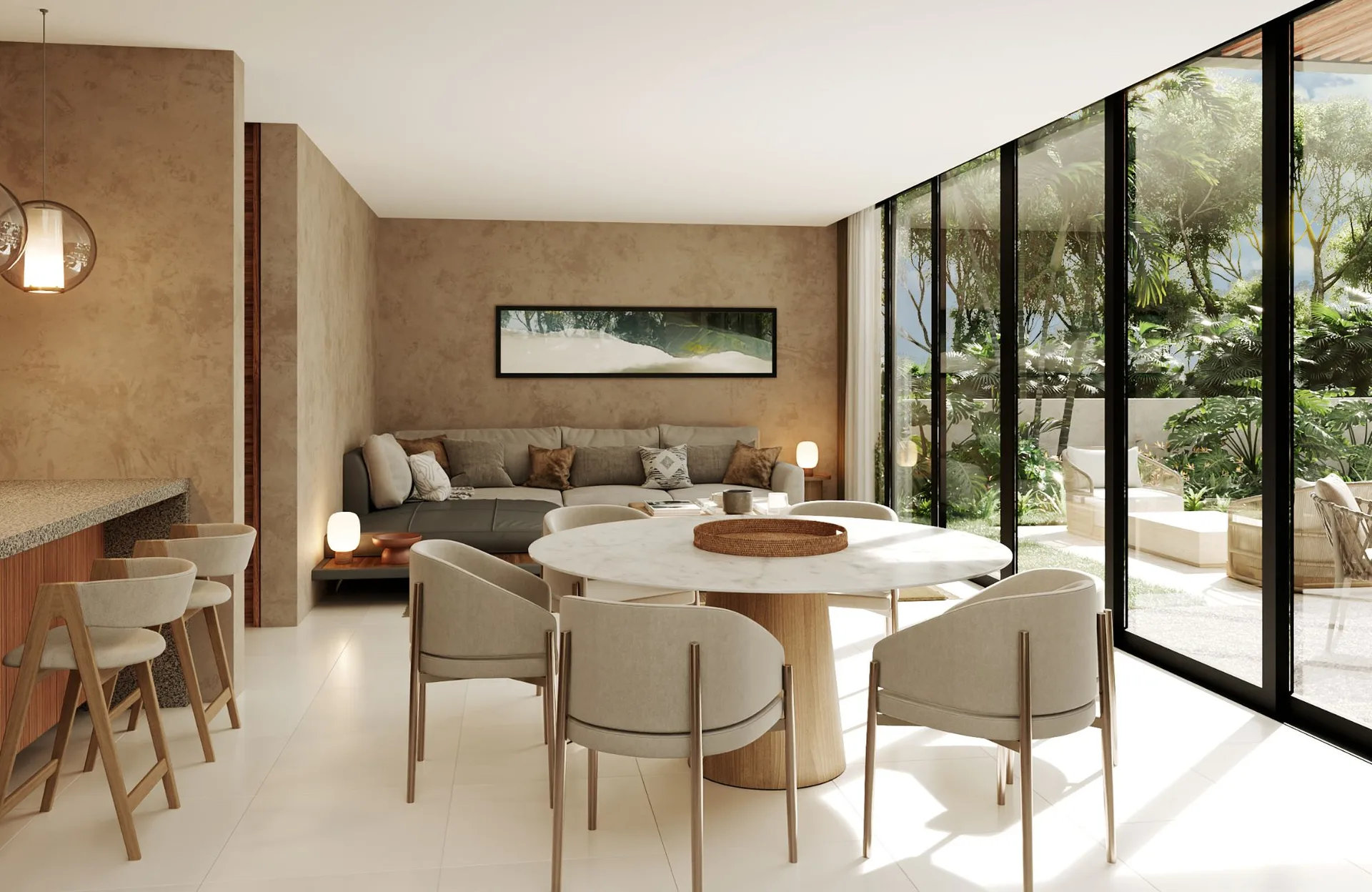 The property is located in a serene area between Playa del Carmen and Tulum, surrounded by nature and tranquility. It features a modern design with spacious layouts.