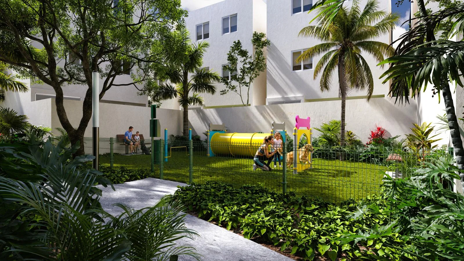 Building amenities include a swimming pool with a wading area and lounging zone, a covered grill area with a bar and pergola for gatherings, green spaces with a relaxation pergola, a pet park, an outdoor children's playground, a security booth with controlled access, and visitor parking.
