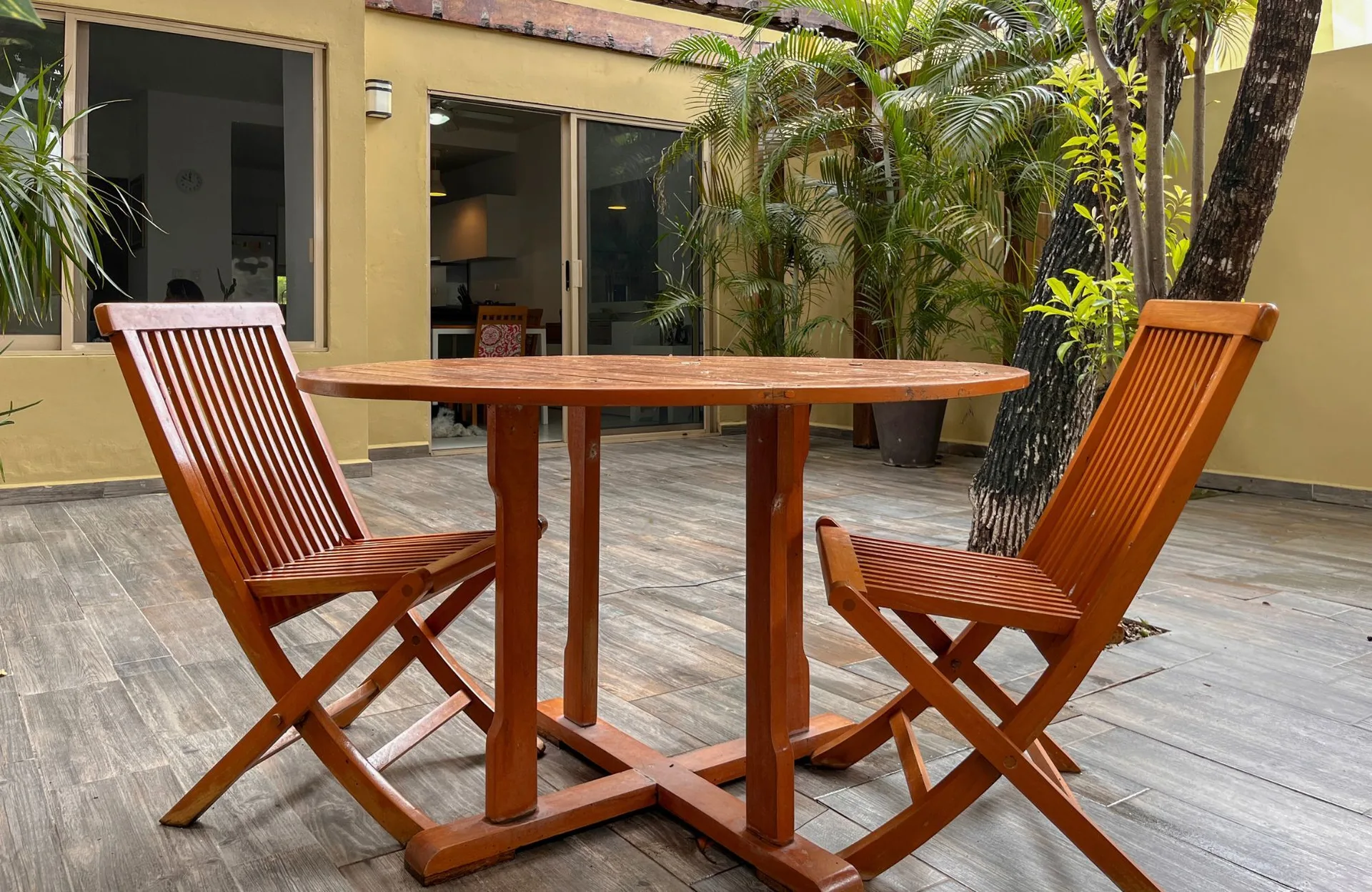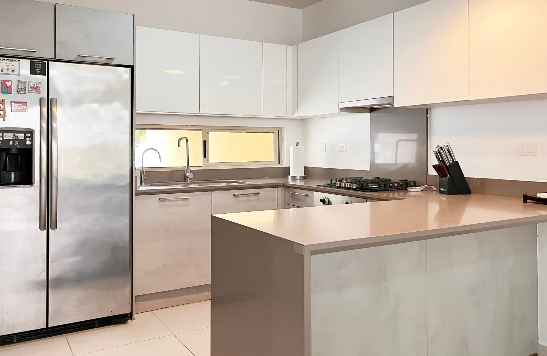 The home is bright and designed to maximize natural light, with an intelligent layout and spacious rooms. It features three bedrooms, each with an en-suite bathroom. European hurricane shutters are installed throughout the property. The interior includes a living room, dining room, and an equipped kitchen. A half bathroom is available for guests. There is covered parking for two vehicles. The house is equipped with 11 solar panels and a reverse osmosis system in the kitchen. The property is fully furnished.