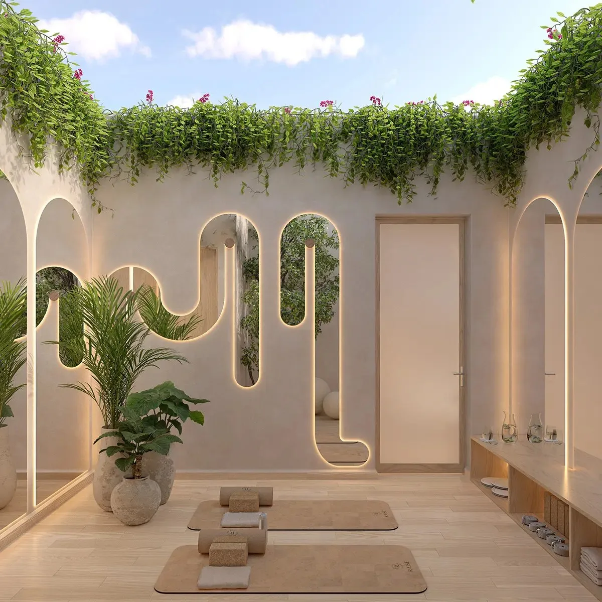 The ground level, covering 1, 037. 42 square feet, contains parking, the main access, a double-height living room, a half bathroom, the kitchen, a laundry room, a dining room, the garden, the pool, and stairs. The first level, spanning 1, 039. 68 square feet, houses bedroom three and bedroom four, along with stairs. The second level, covering 929. 14 square feet, contains bedroom two, the master bathroom, an open yoga area, and stairs.