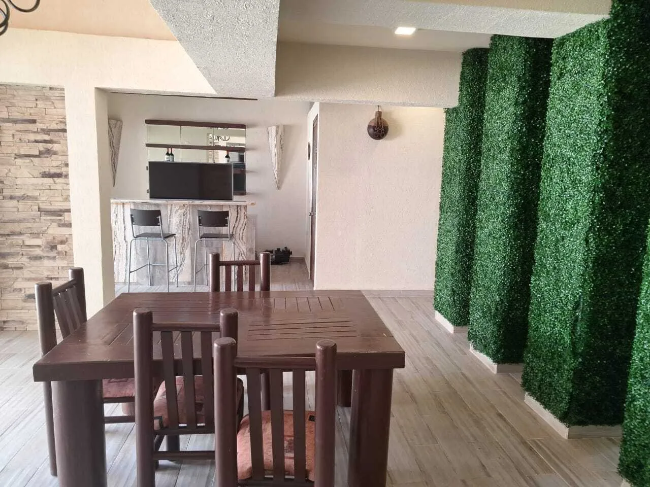 This two-story home features a private pool with a wading area and a rooftop terrace. The layout includes a spacious dining kitchen, an onyx bar, a double-height foyer, elegant chandeliers, and a laundry area with a shower.