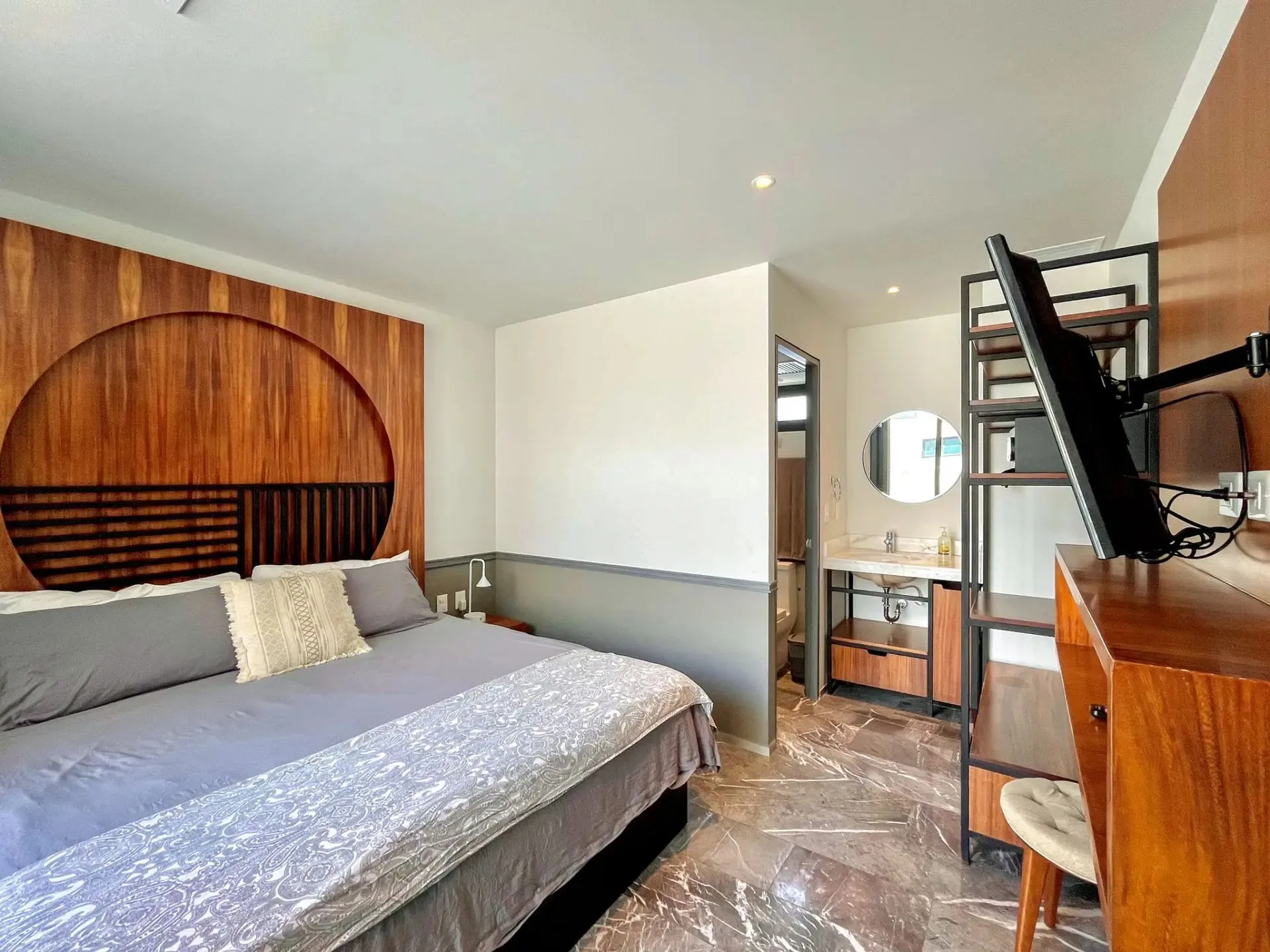 This property is a three-bedroom lock-off rooftop residence with ocean views, situated in Downtown Playa del Carmen just one block from the beach and one block from Fifth Avenue. It is located on the top floor and features three full bathrooms, marble floors, and fine wood finishes throughout.