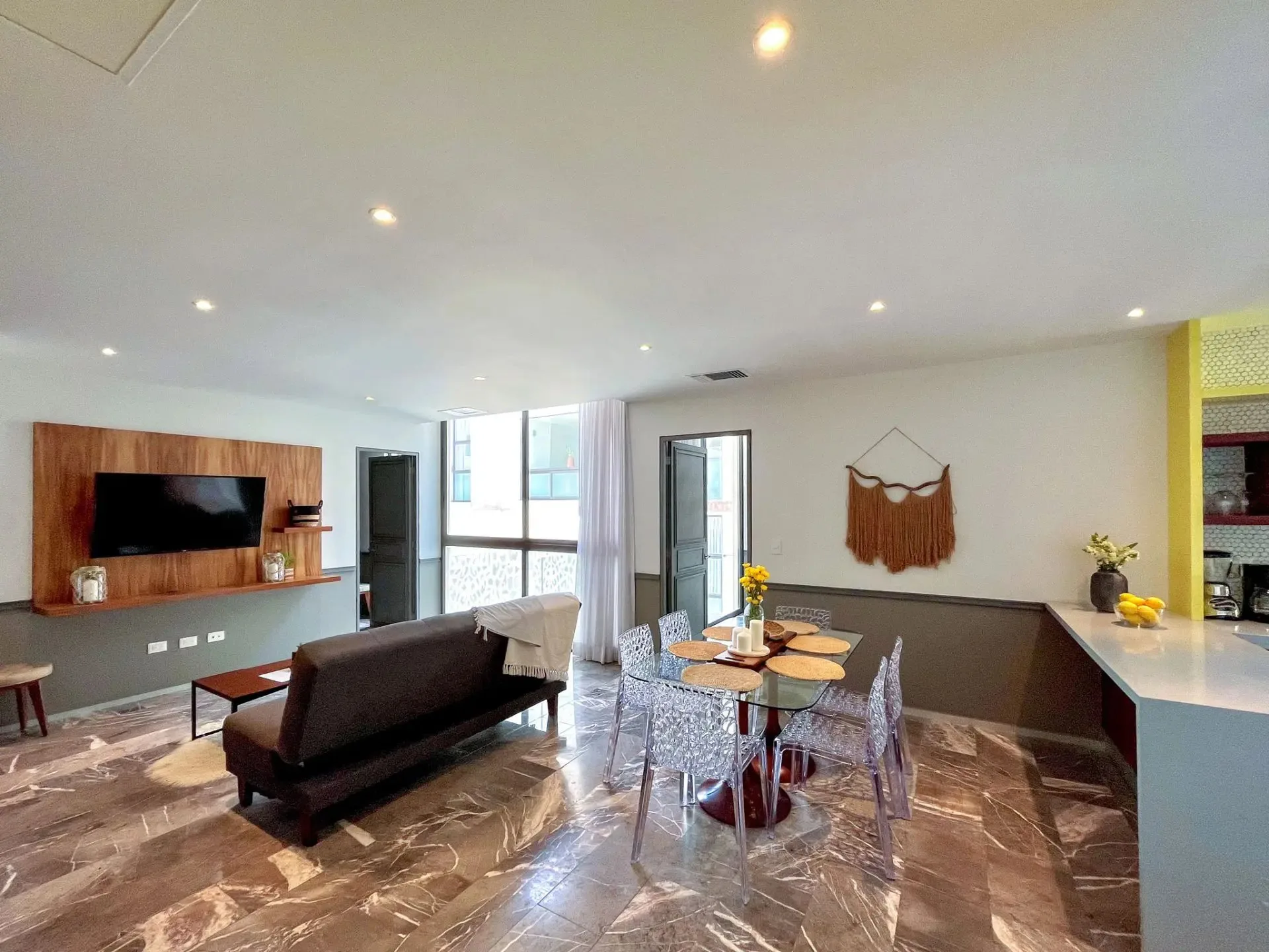 The layout offers a large open concept where the living room, dining area, and kitchen connect. A bar area off to the side complements the expansive living space. The area includes a comfortable sofa bed and a well-appointed television. The kitchen is equipped with modern appliances and provides breathtaking ocean views.