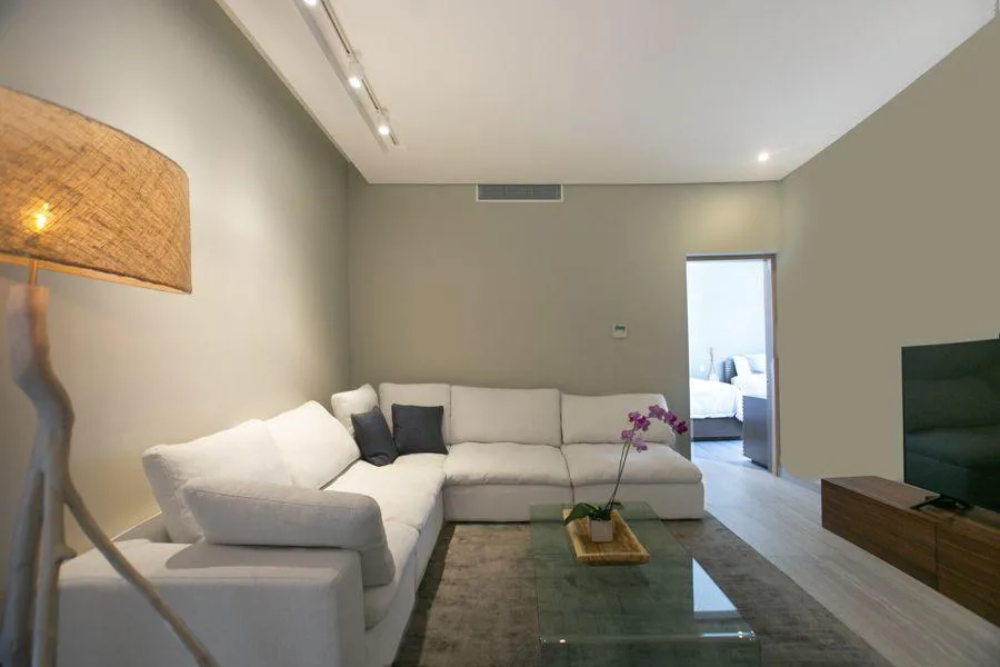 This penthouse unit includes three bedrooms, three and a half bathrooms, a laundry room, a kitchen, a dining area, a living room, a family room, and a storage room. It is fully furnished, equipped, and decorated.