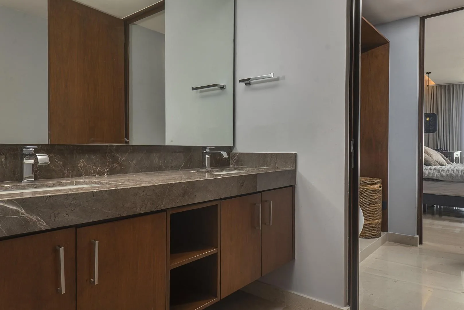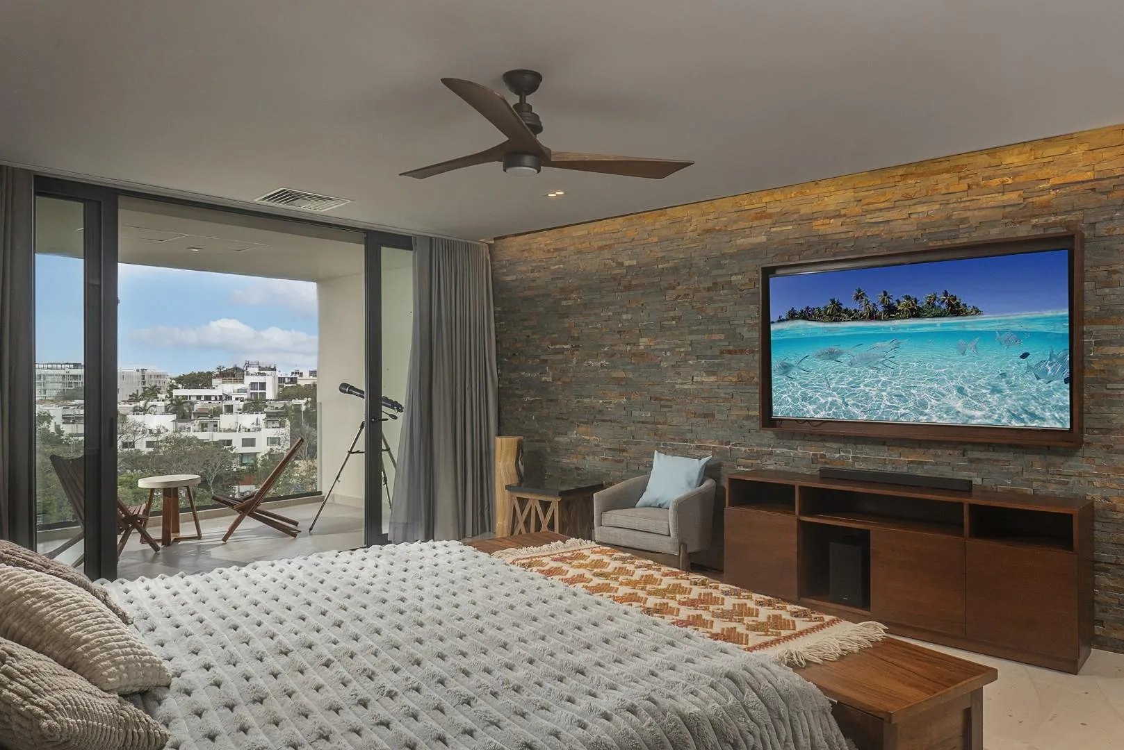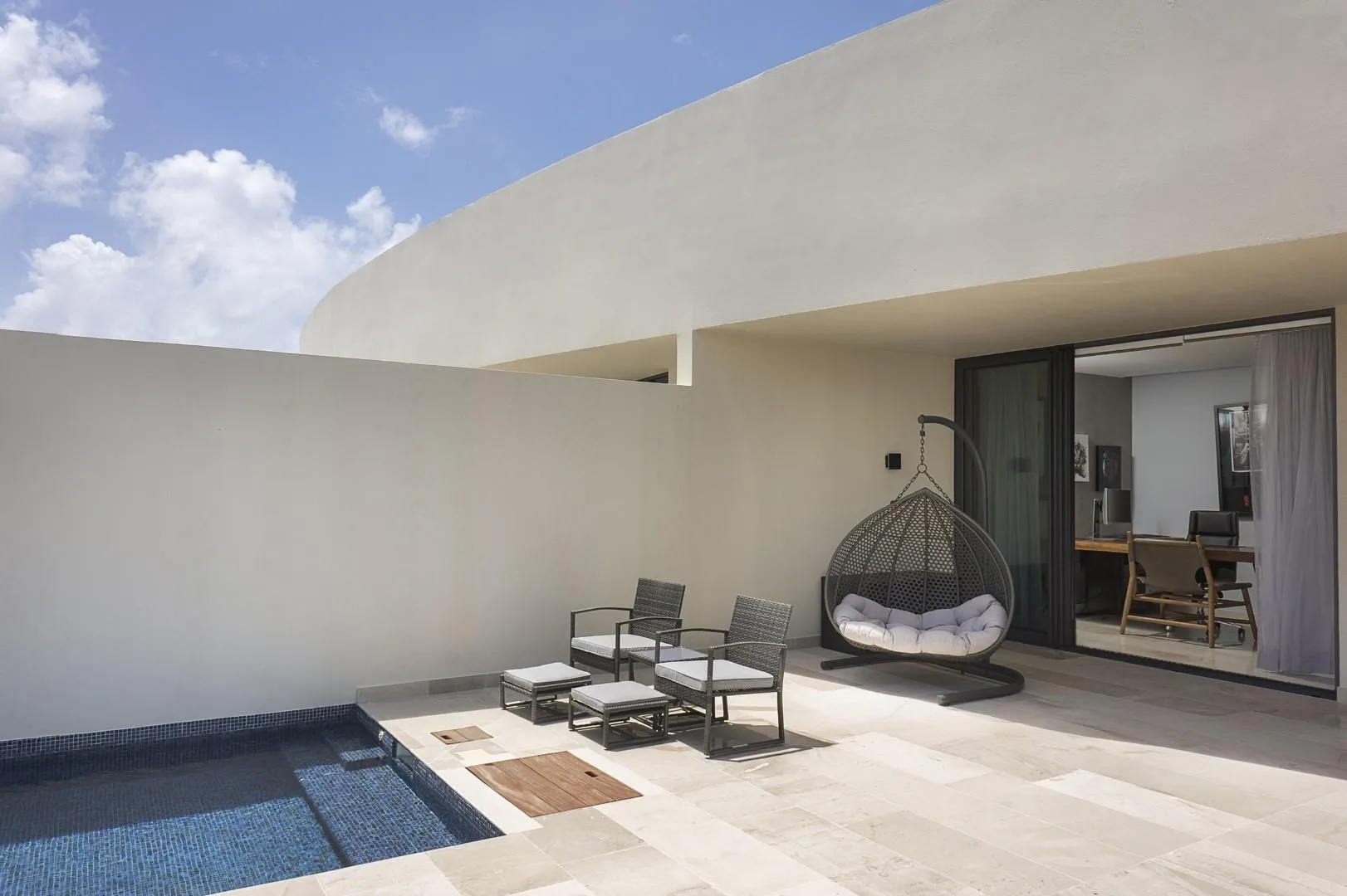 The upper level is dedicated to the expansive primary suite, which offers lush green views and natural light. This level includes a large walk-in closet, a luxurious en-suite bathroom, a full-size private office, and a mini kitchen for convenience. The outdoor penthouse terrace features a plunge pool and lounge areas, creating a serene oasis with uninterrupted views of the Caribbean Sea, the white-sand beach, and the city skyline.