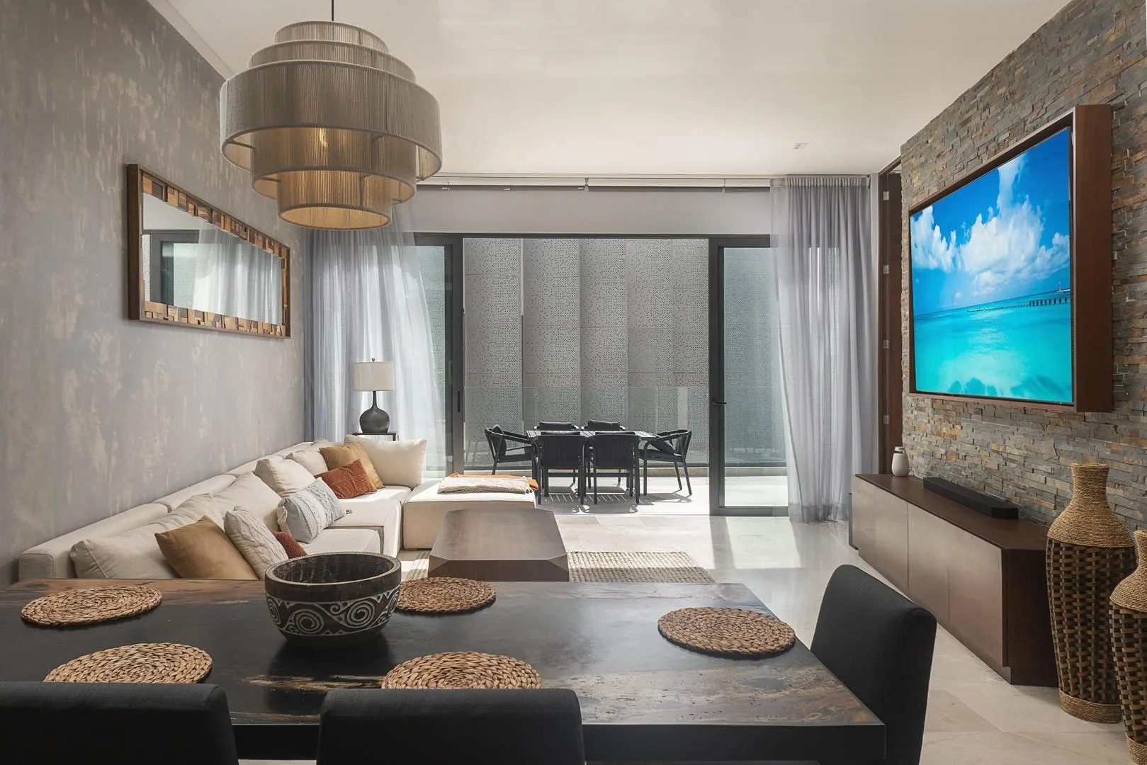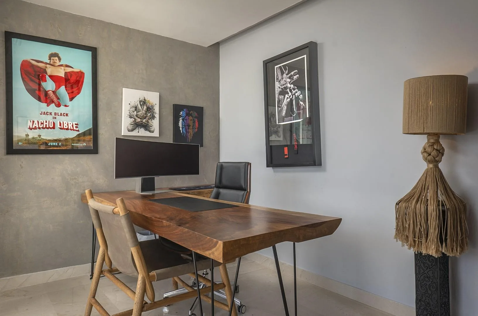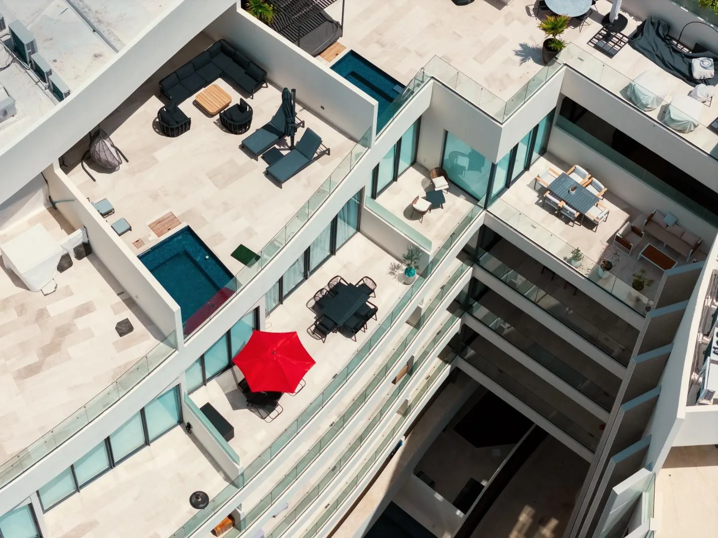 The upper level is dedicated to the expansive primary suite, which offers lush green views and natural light. This level includes a large walk-in closet, a luxurious en-suite bathroom, a full-size private office, and a mini kitchen for convenience. The outdoor penthouse terrace features a plunge pool and lounge areas, creating a serene oasis with uninterrupted views of the Caribbean Sea, the white-sand beach, and the city skyline.