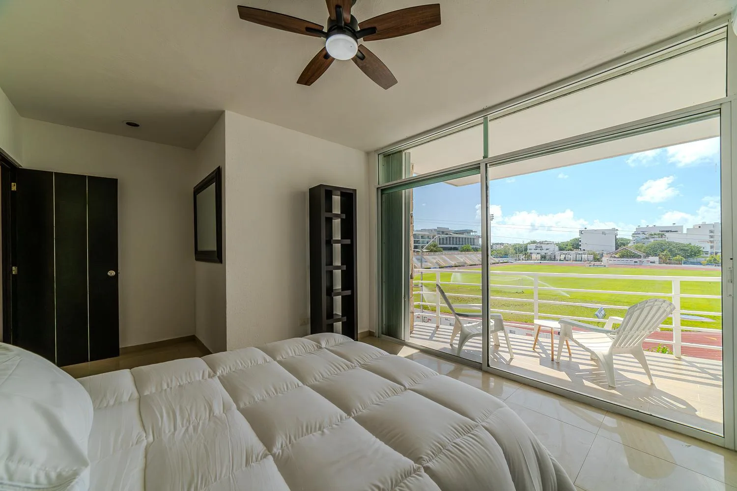 The property features three balconies offering views of the swimming pool and landscaped gardens. The front balcony provides views of the Inter Playa stadium across the street. The spacious living room includes a 55-inch Smart HD TV with cable and high-speed internet connectivity.