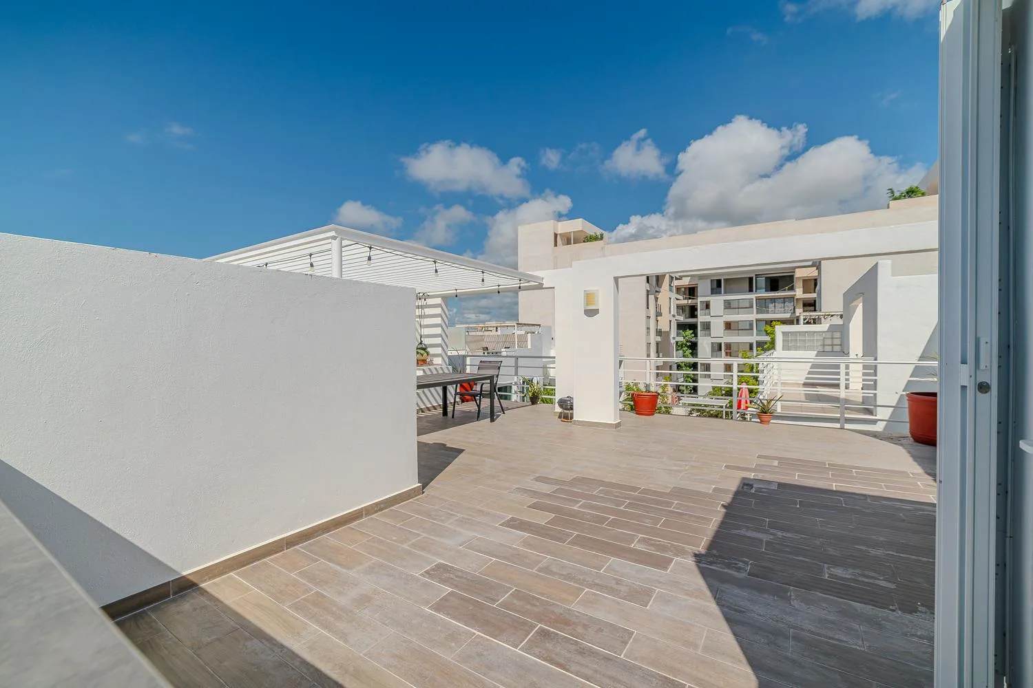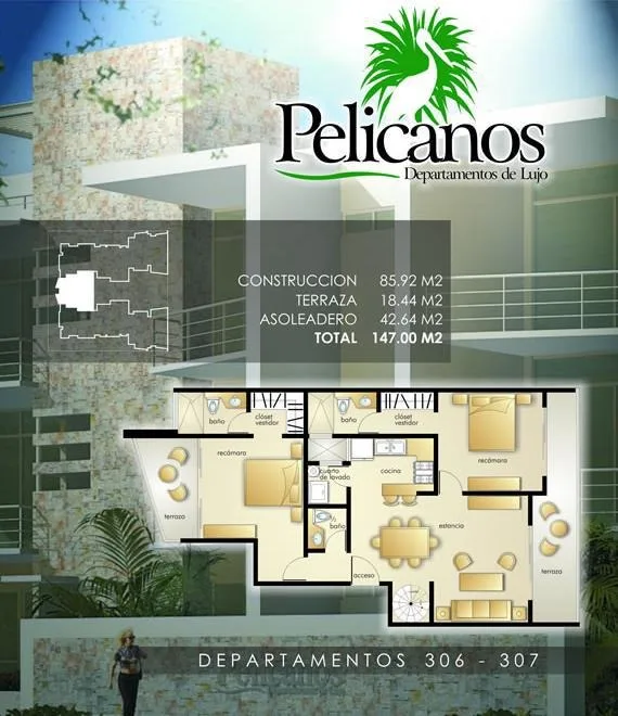 This fully furnished two-bedroom penthouse is located on the third floor of Condominium Pelicanos. It offers 104 square meters of interior space complemented by a 43-square-meter rooftop terrace ideal for relaxation and entertaining.