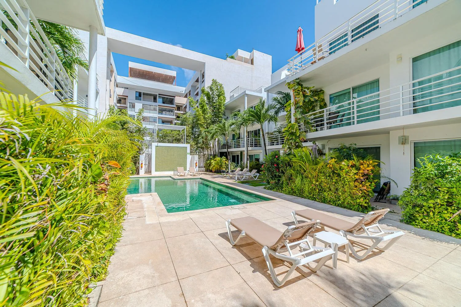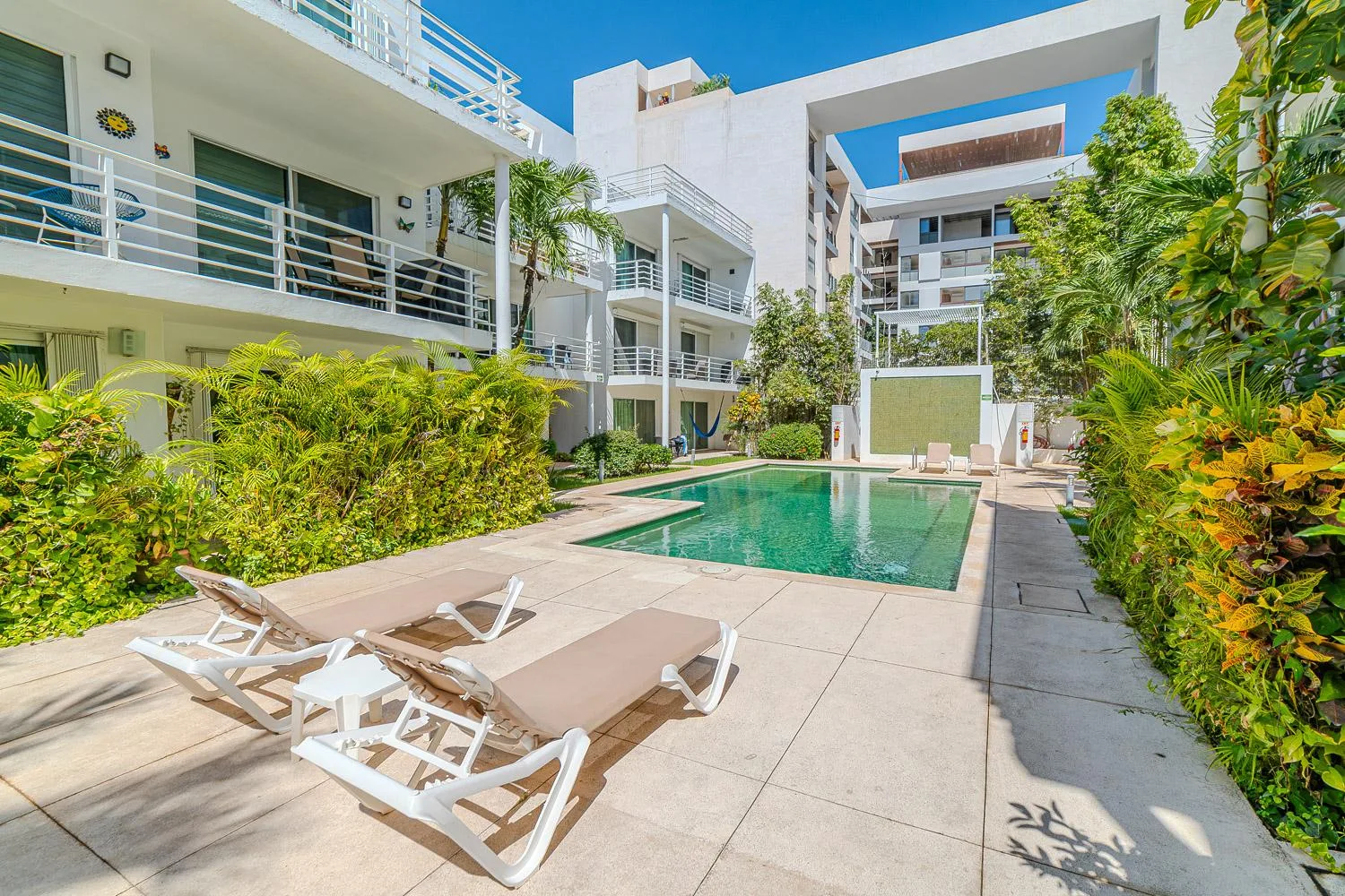 Building amenities include a swimming pool, beautifully landscaped green areas with lounge chairs, and 24/7 security. The location is in the heart of Playa del Carmen, just a few blocks from Fifth Avenue, grocery stores, restaurants, banks, and the beach.