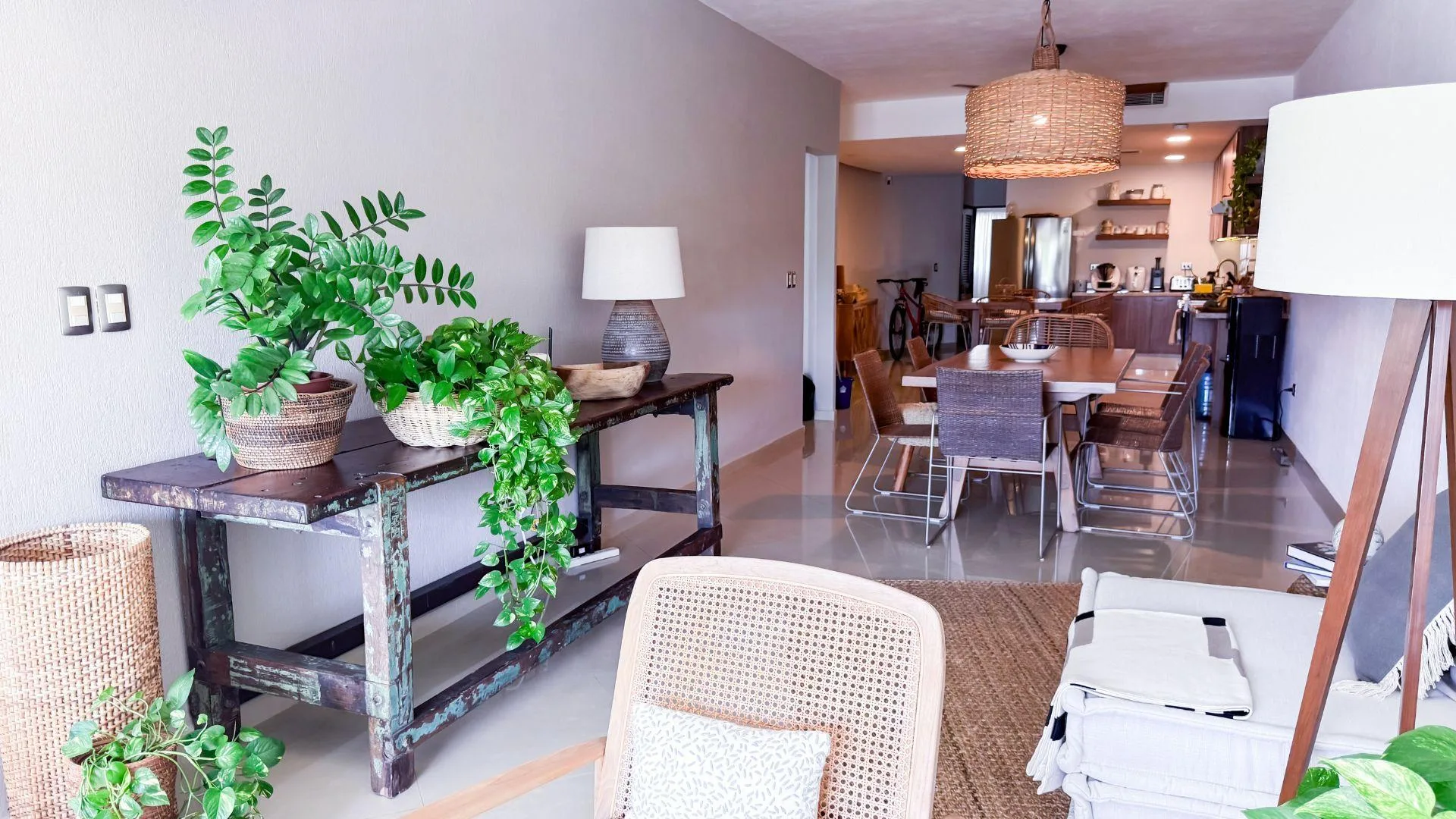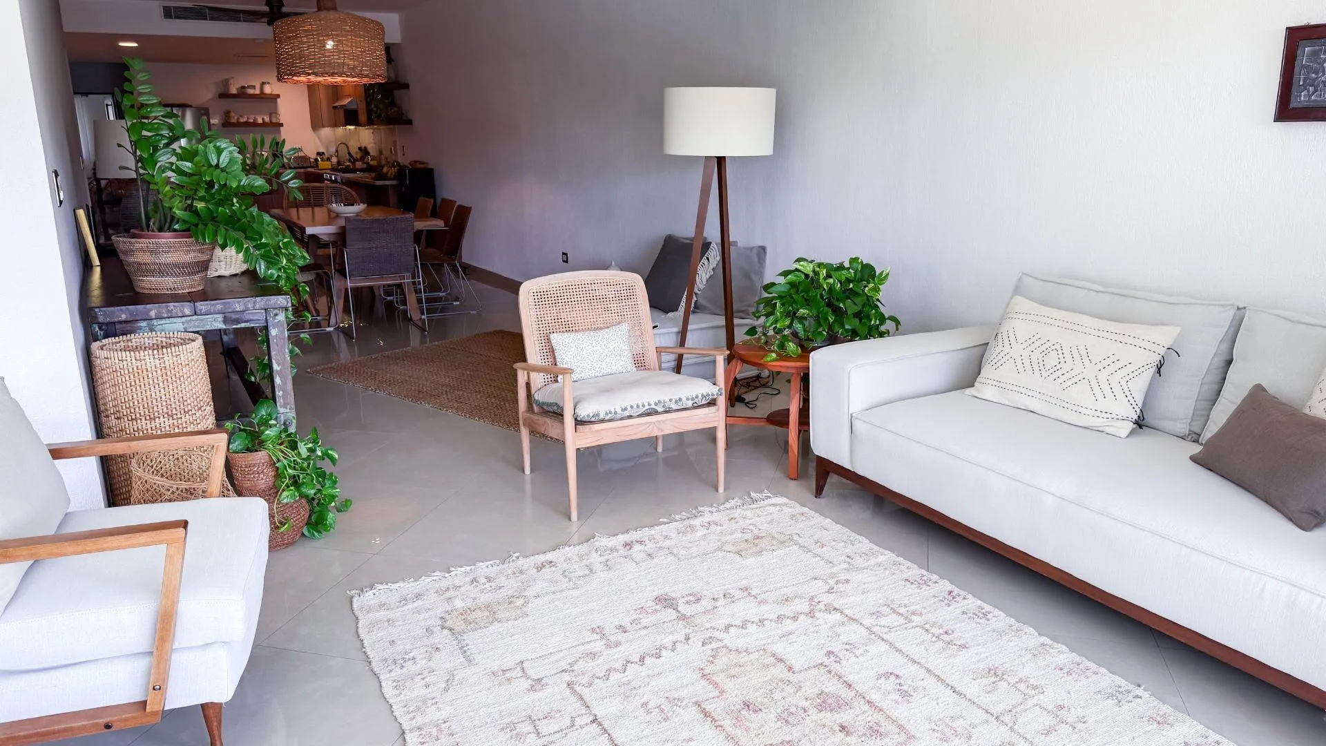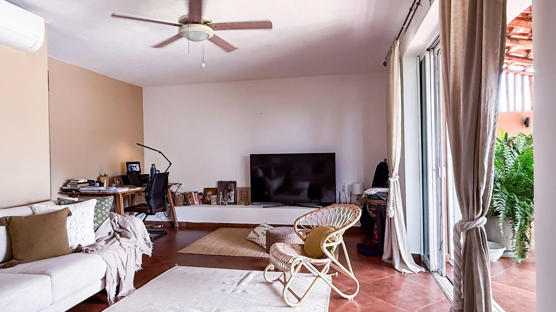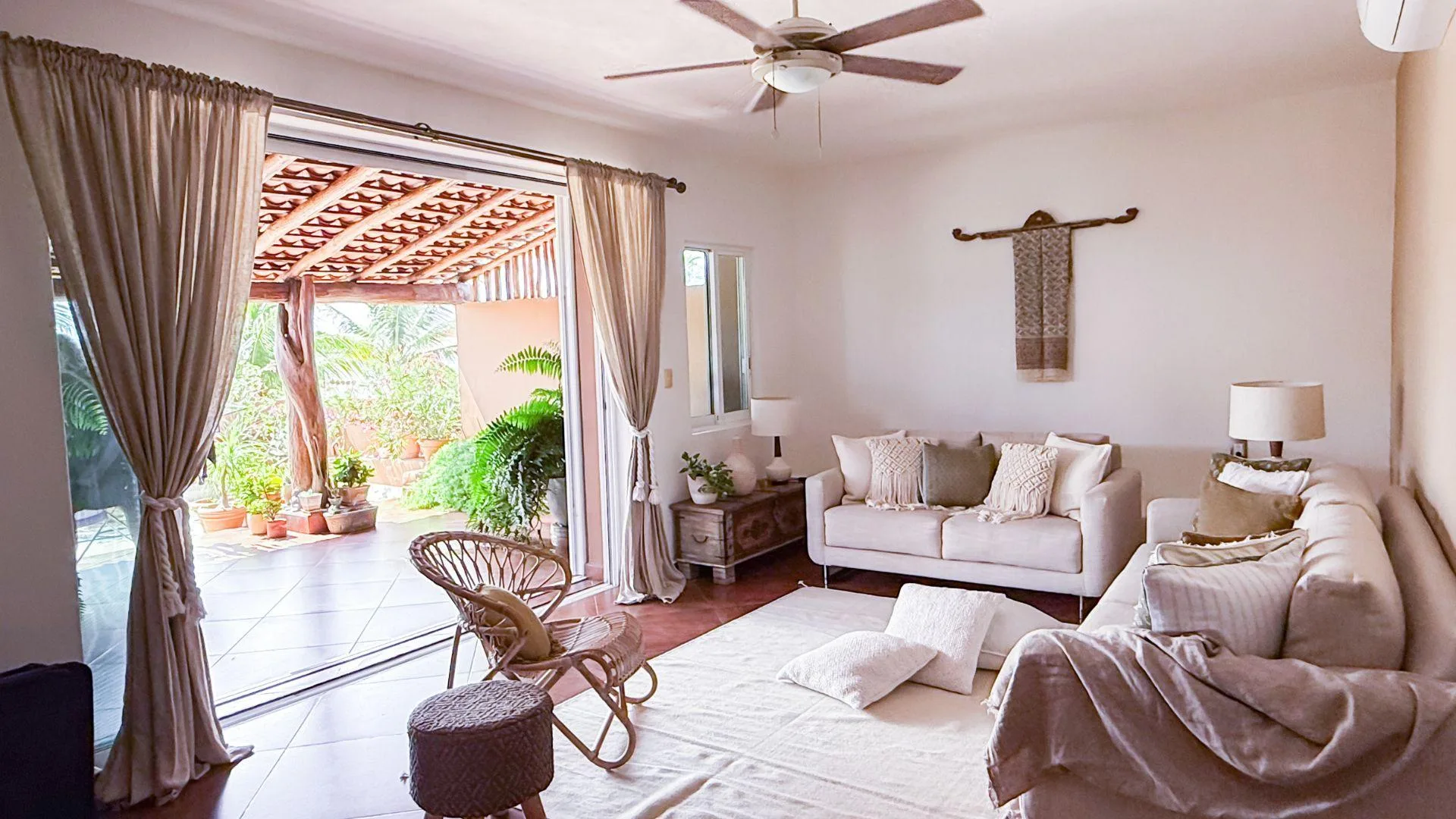 The living and dining area provides access to a balcony and the terrace. The private covered terrace is equipped with a jacuzzi, a palapa, and open-air space. The property includes private covered parking.