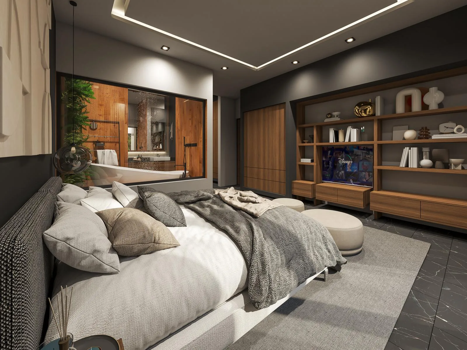 The exterior area includes a private pool and a pool bar zone. Balconies provide open views. From the upper level, there are panoramic city views and a partial sea view.