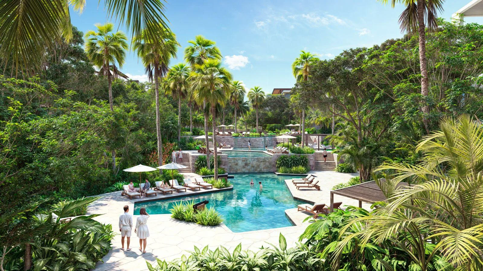 Additional amenities for the complex include a drop-off roundabout, a grand plaza access, a café/deli with a terrace, a lounge with a terrace, a gym, a spa, a yoga room, a children's room, a business center, a multipurpose room, an event garden, paddle tennis and pickle ball courts, and underground visitor parking.