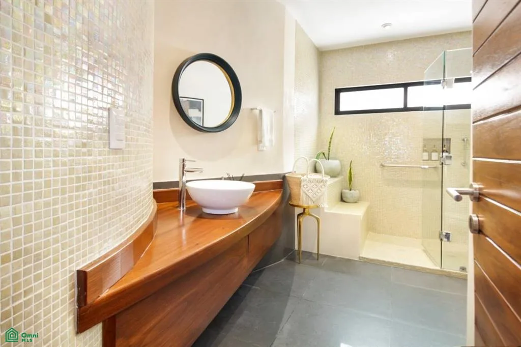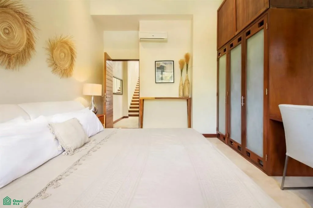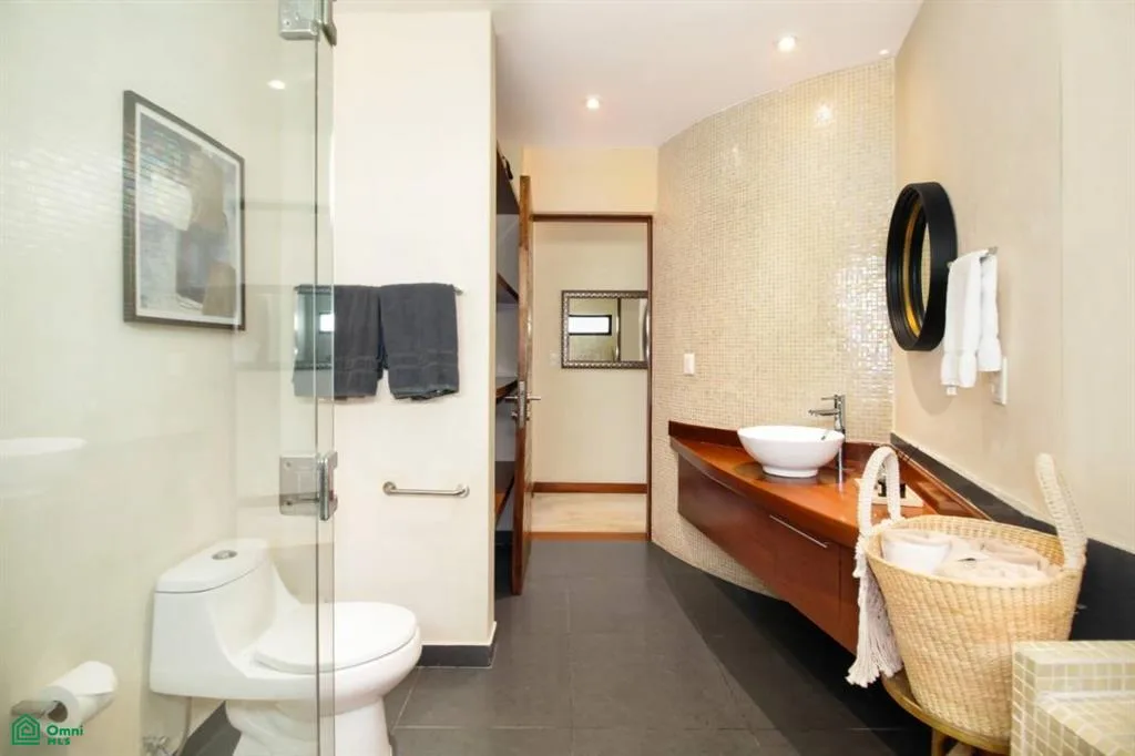 The first level features an open-concept social area. This includes a living room, a dining area with a solid Parota wood table, and a contemporary integrated kitchen. The kitchen is equipped with matte quartz countertops, soft-close cabinetry, and an independent pantry room. This level also includes two large master suites. Each suite has a private bathroom with a minimalist-industrial style, walk-in showers, high-end finishes, and a custom walk-in closet in natural wood with integrated LED lighting. A fully equipped laundry room is also located on this level.