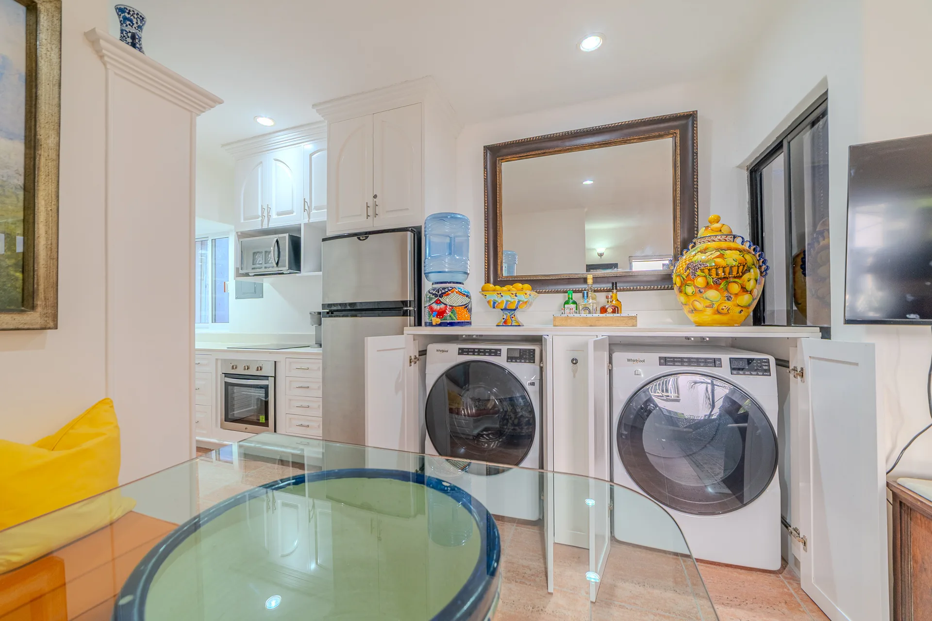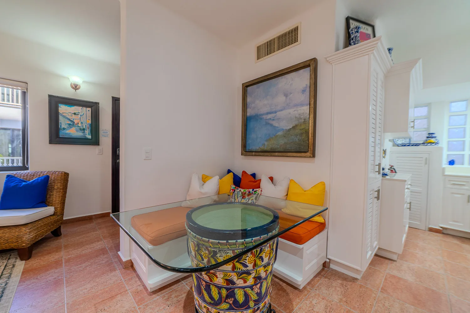 This furnished, turn-key one-bedroom condominium is located on the top floor of the building. It is situated on 26th Street North, between Fifth Avenue and First Avenue, in a central area of Playa del Carmen. The location is just three blocks from Mamitas Beach and is within steps of restaurants, shops, and all amenities.