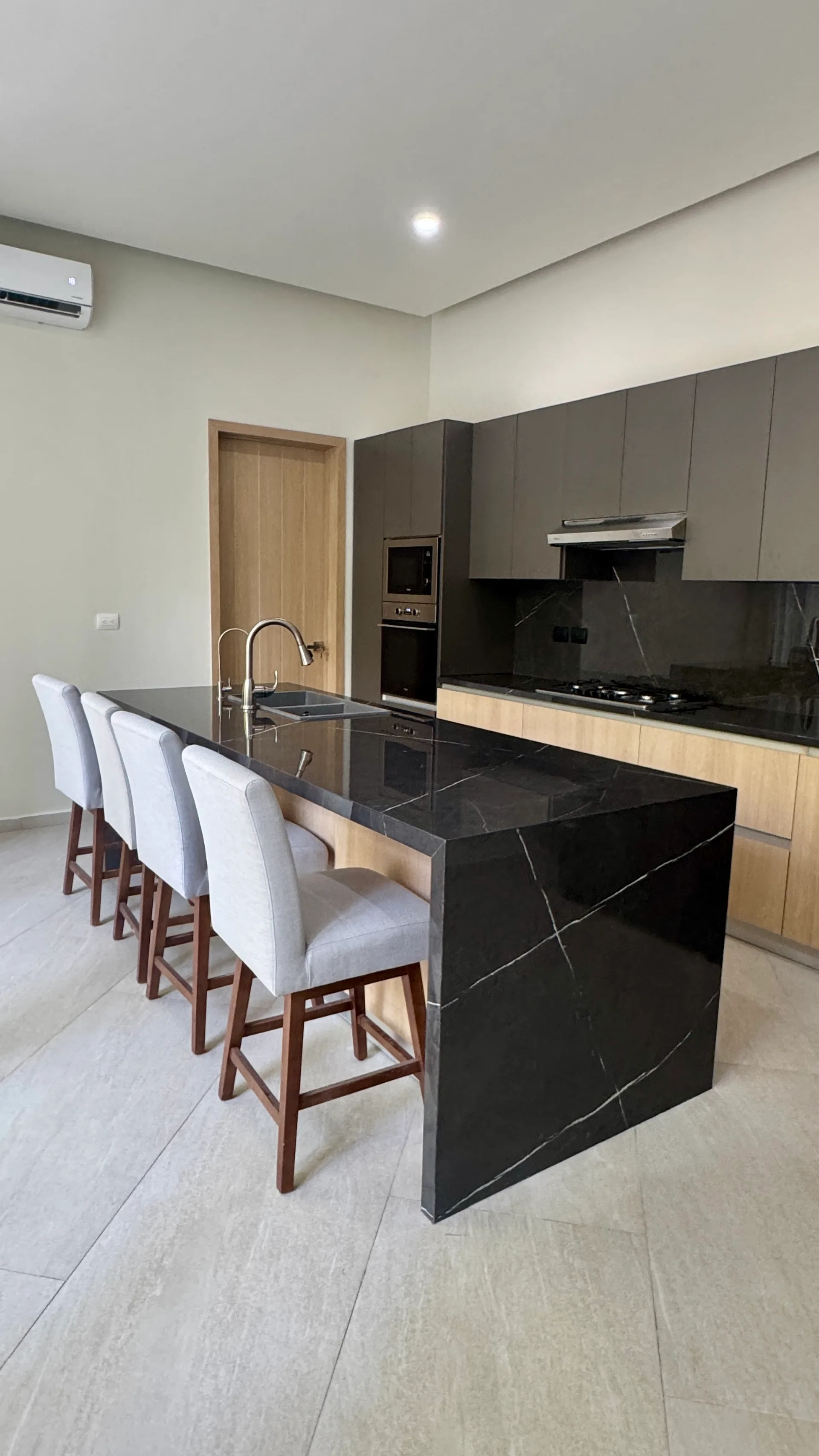 The villa features five bedrooms and seven bathrooms. Each bedroom includes an en-suite bathroom. A multi-purpose room is also present, suitable for use as maid's quarters or other purposes. The home is delivered unfurnished and is newly built.