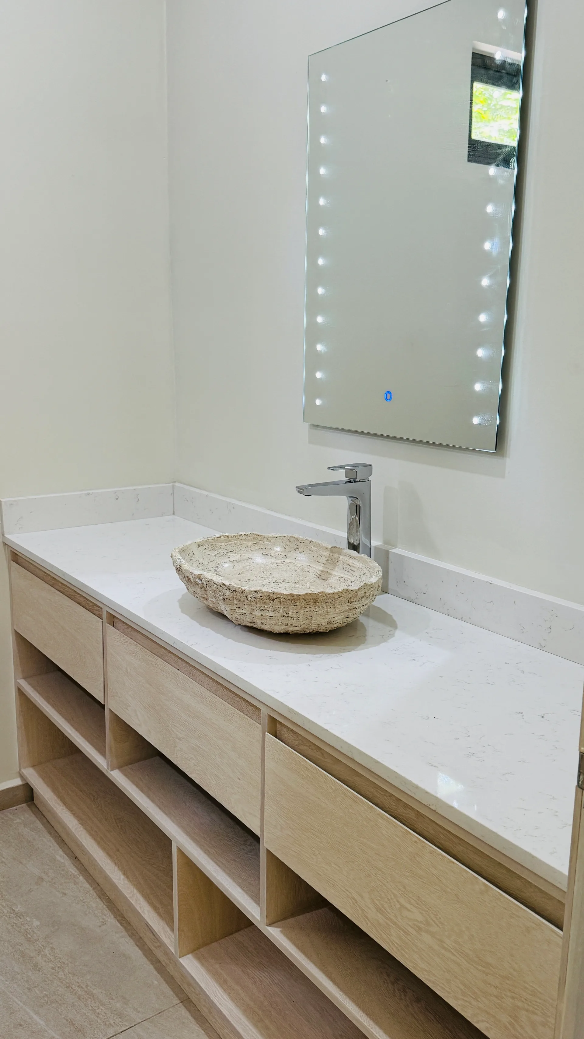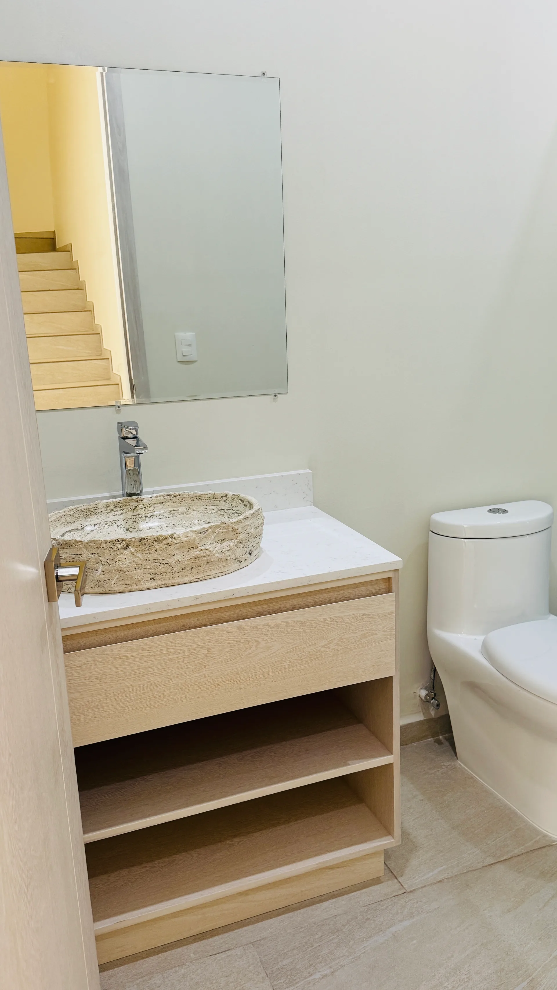 The upper floor features a spacious master bedroom with a double dressing room and a private terrace overlooking the jungle. This level also includes three secondary bedrooms with private bathrooms, as well as an office or TV room.