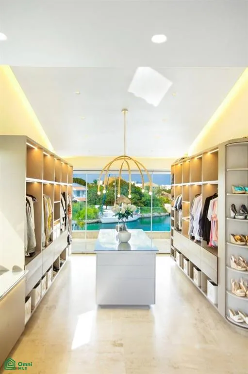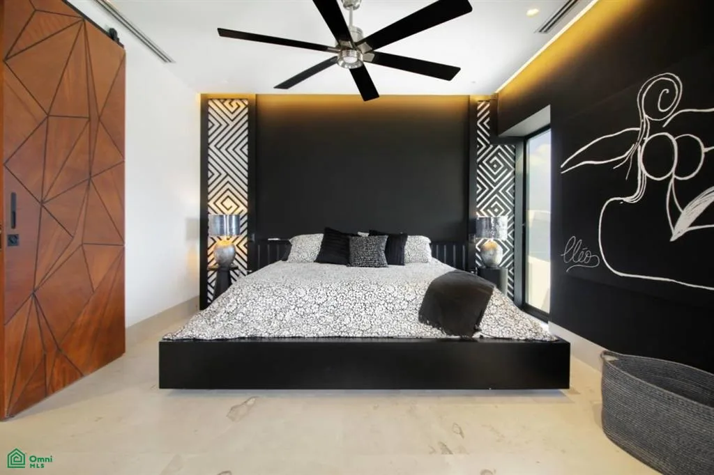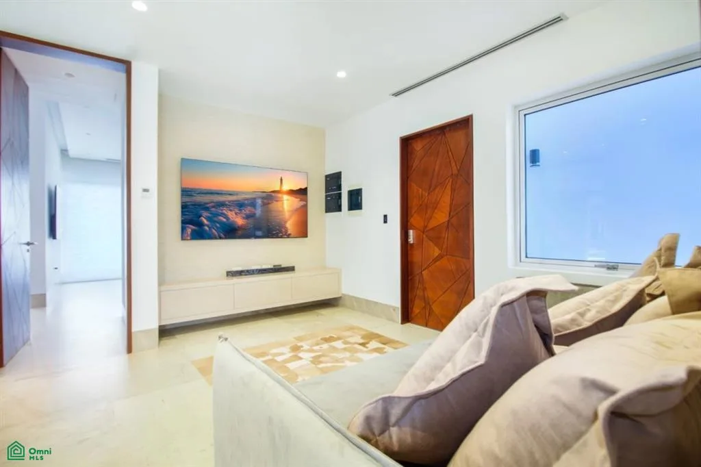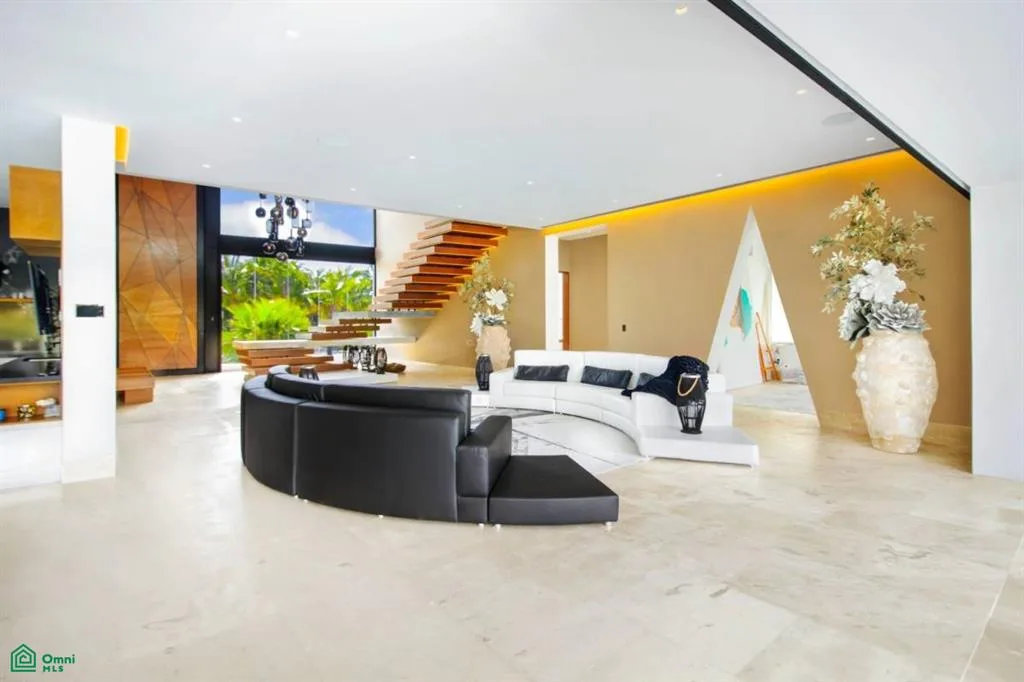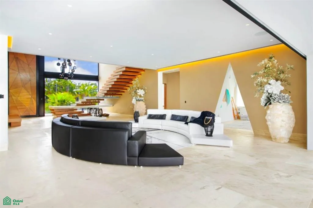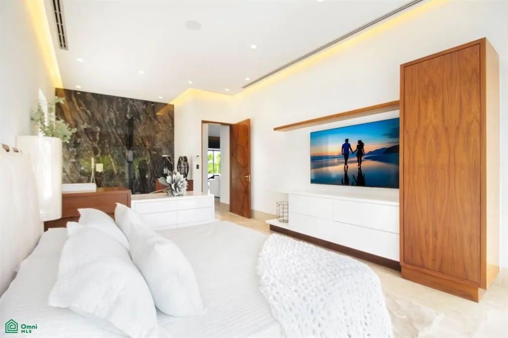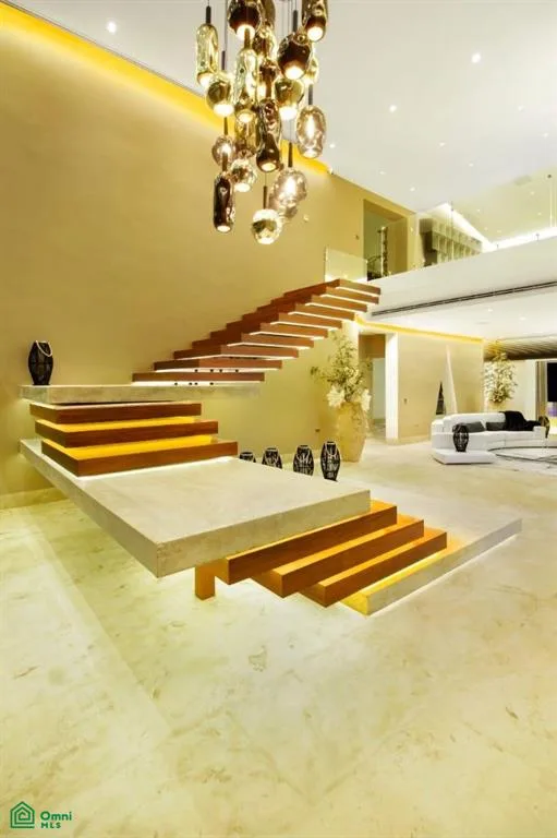A magnificent 8-meter-high entrance door opens to a double-height foyer featuring a solid wood floating staircase. The residence includes five palatial bedrooms, each with a private en-suite bathroom and a walk-in closet. The home features an integrated smart home system for controlling lighting, climate, security, and entertainment.