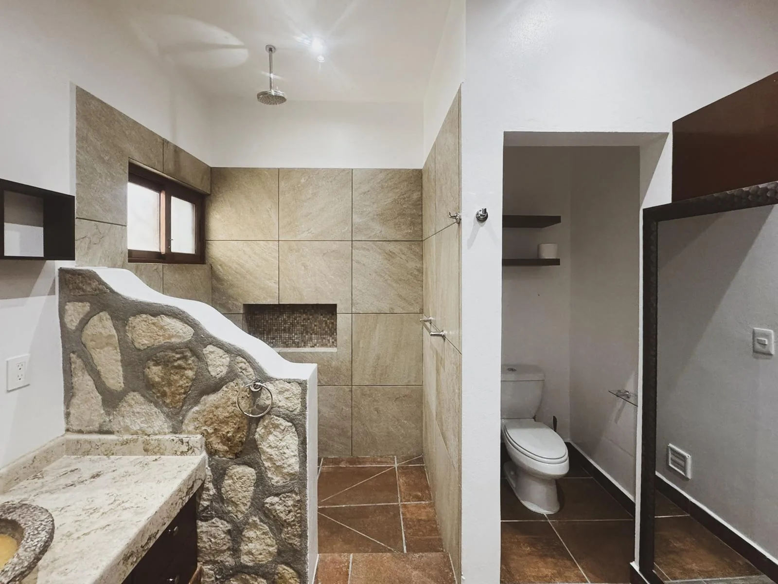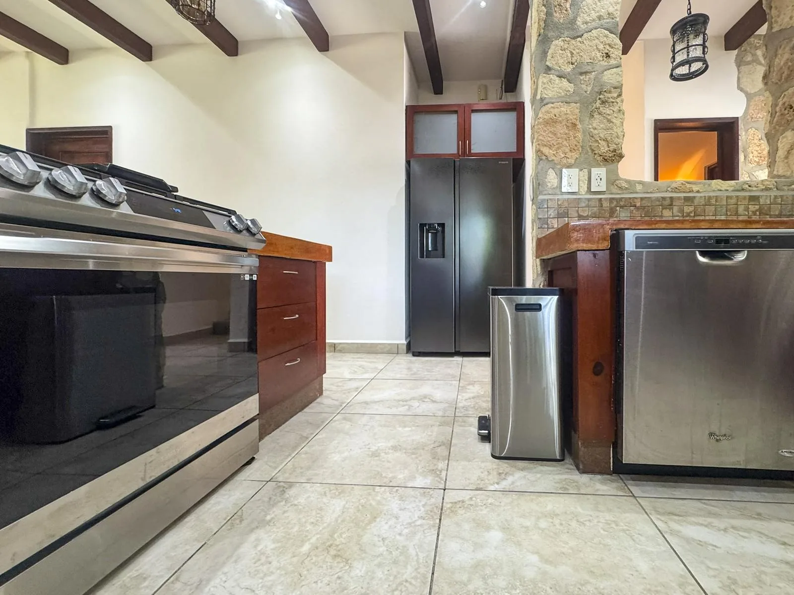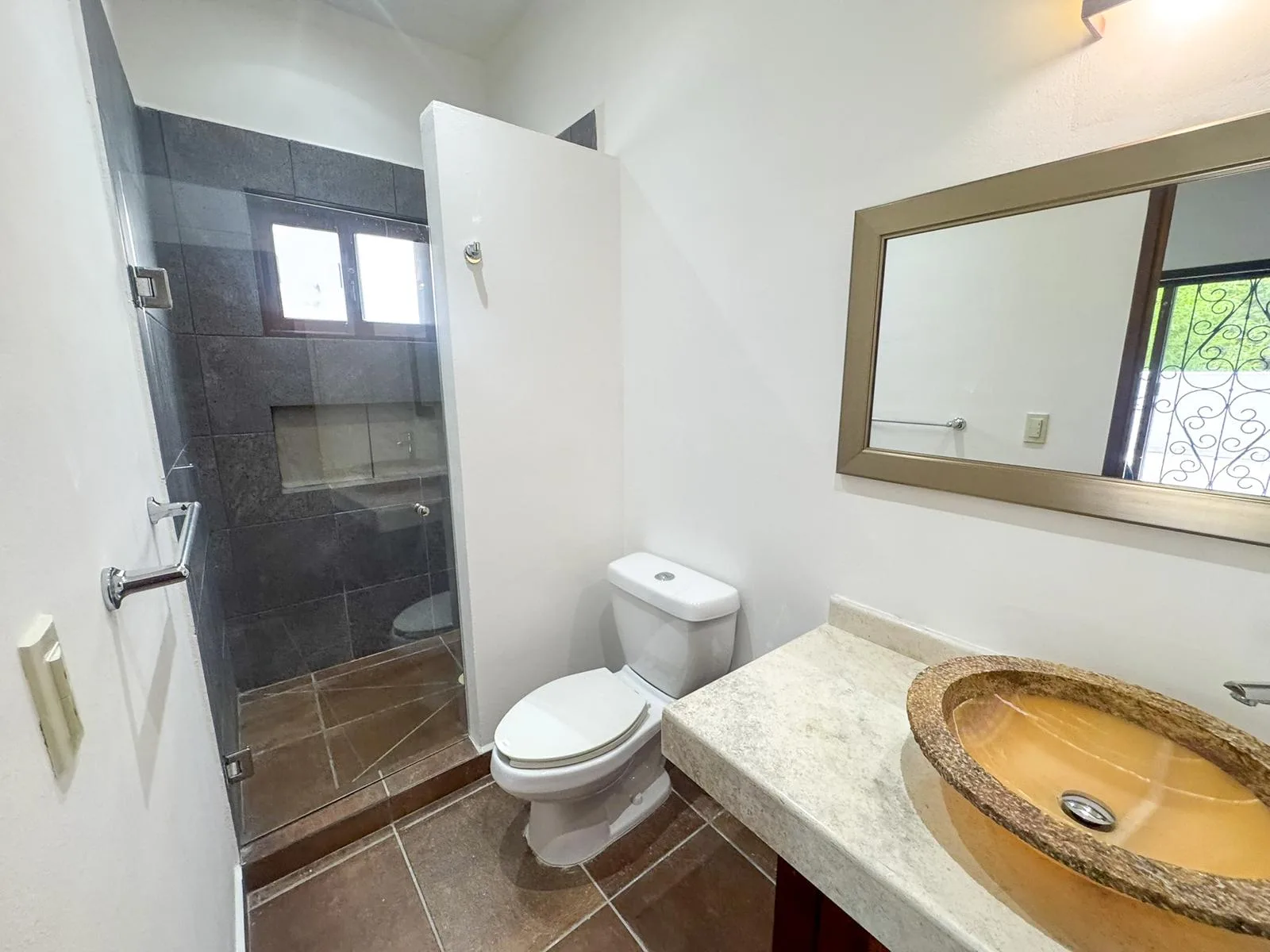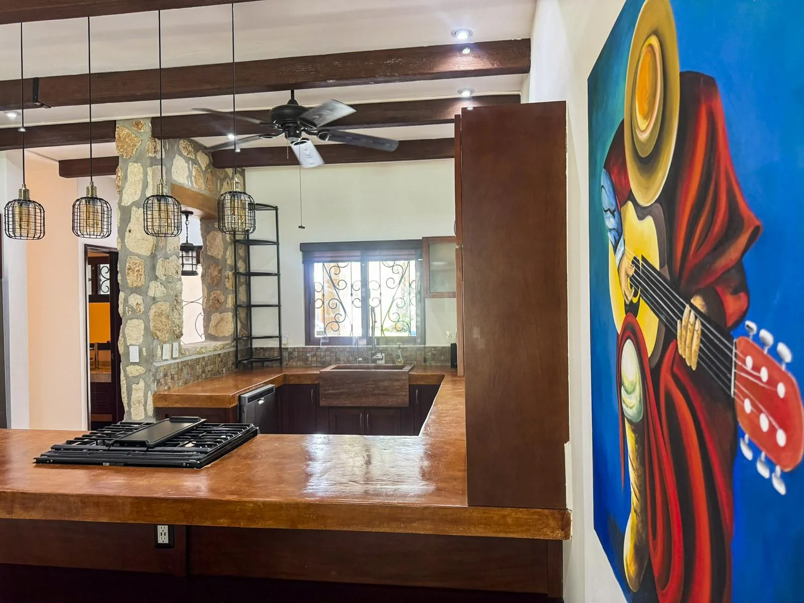 The home features an open-concept design that seamlessly integrates the kitchen, dining area, and living room. It is finished with hacienda-style details, solid wood carpentry, and artisan touches. A half bathroom is conveniently located on the main level. The primary bedroom is situated on the ground floor for privacy and includes a full ensuite bathroom, a walk-in closet, and direct access to the backyard garden.
