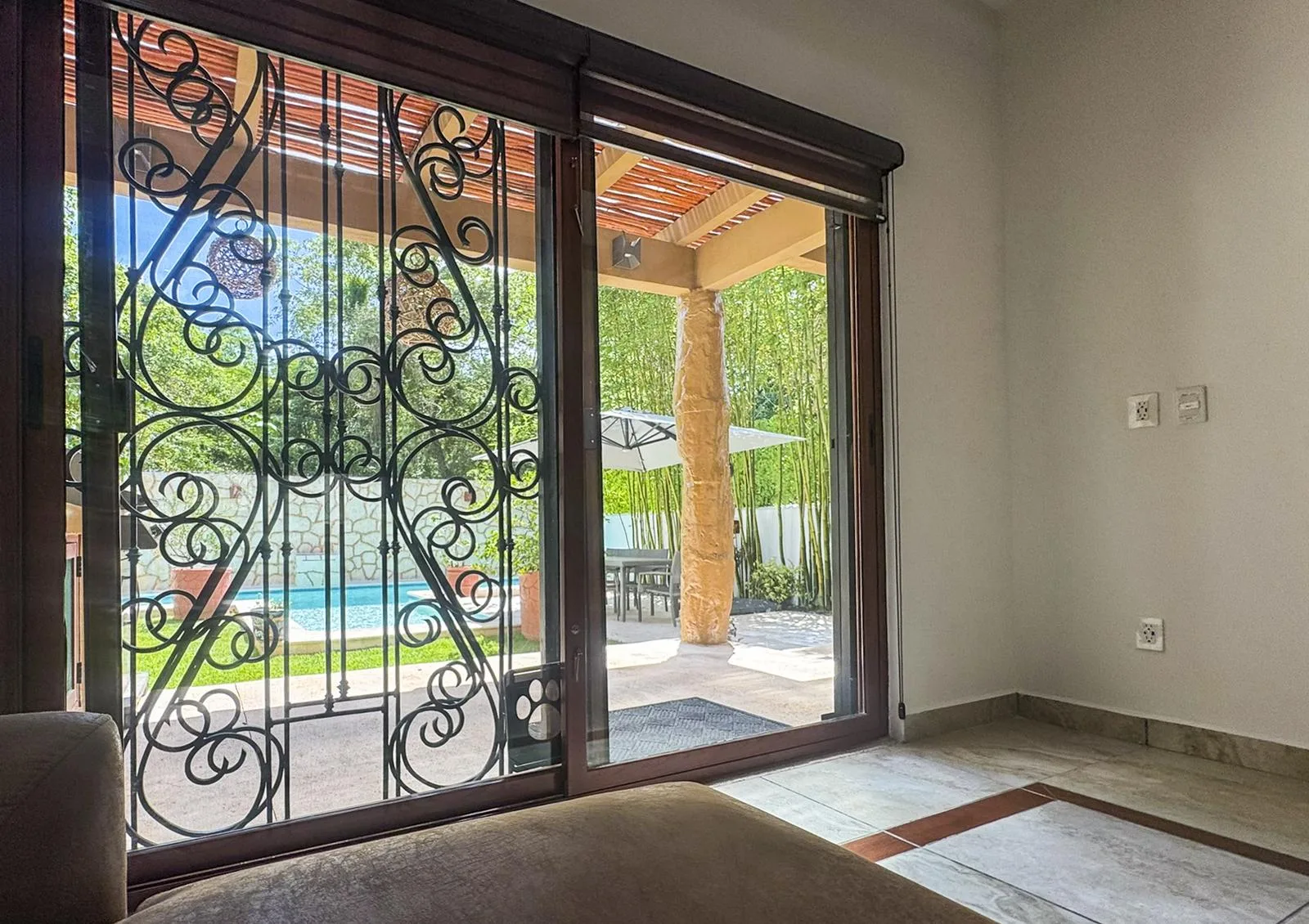 The outdoor area functions as a private tropical oasis with sliding glass doors opening to an expanded swimming pool surrounded by lush vegetation. The space includes an outdoor dining area, sun loungers, and a grill area, ideal for enjoying the Caribbean climate.