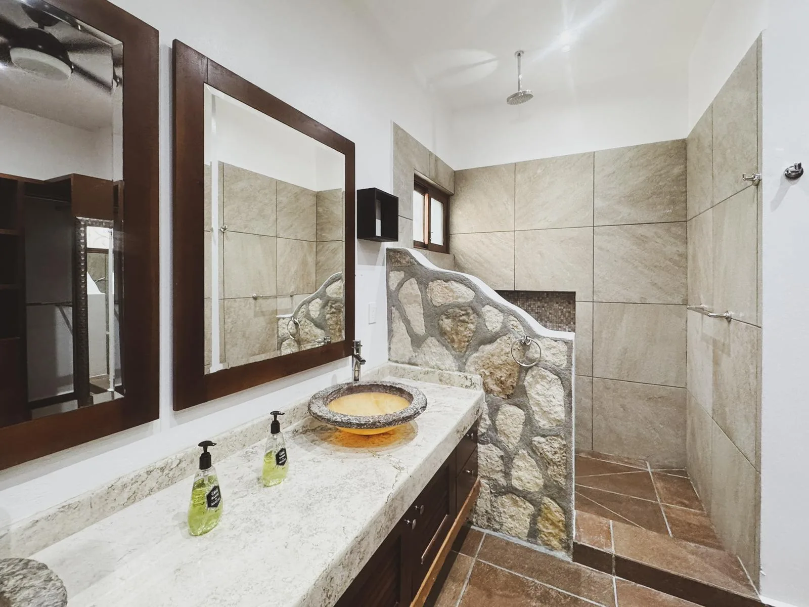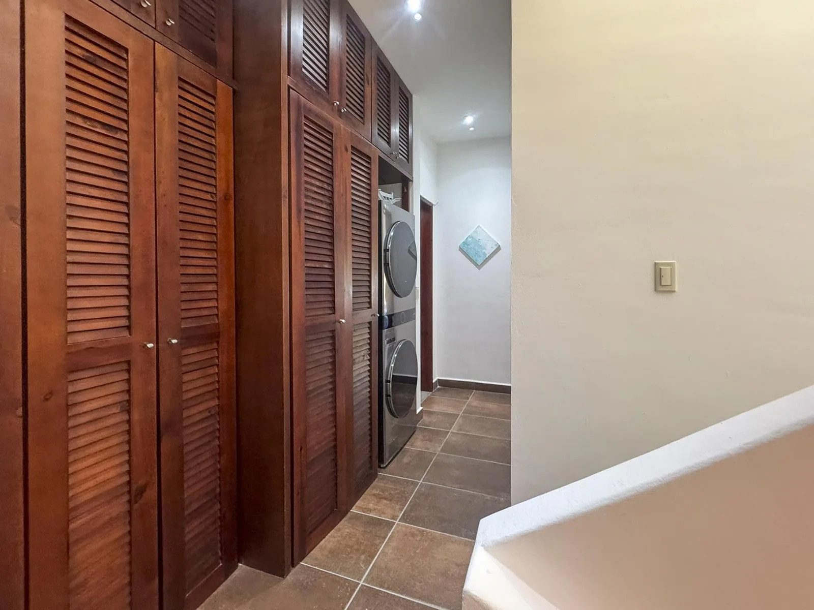 The upper level houses two guest bedrooms, each with a full private bathroom and access to a spacious shared terrace overlooking the garden. This level also includes a laundry area, a linen closet, and generous storage space.