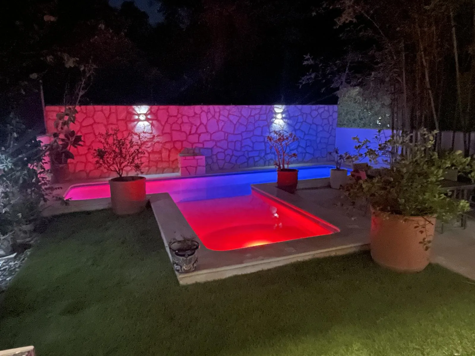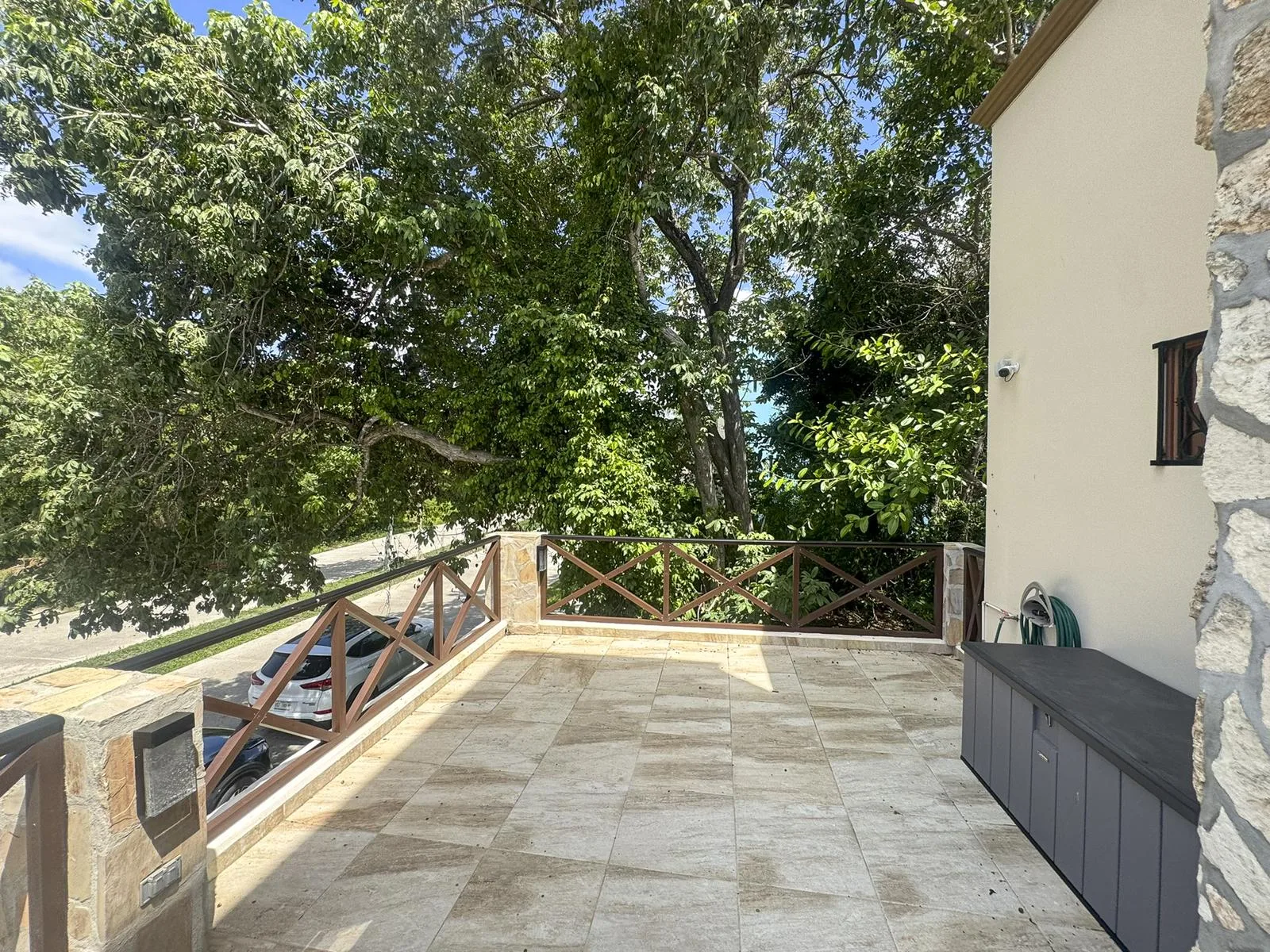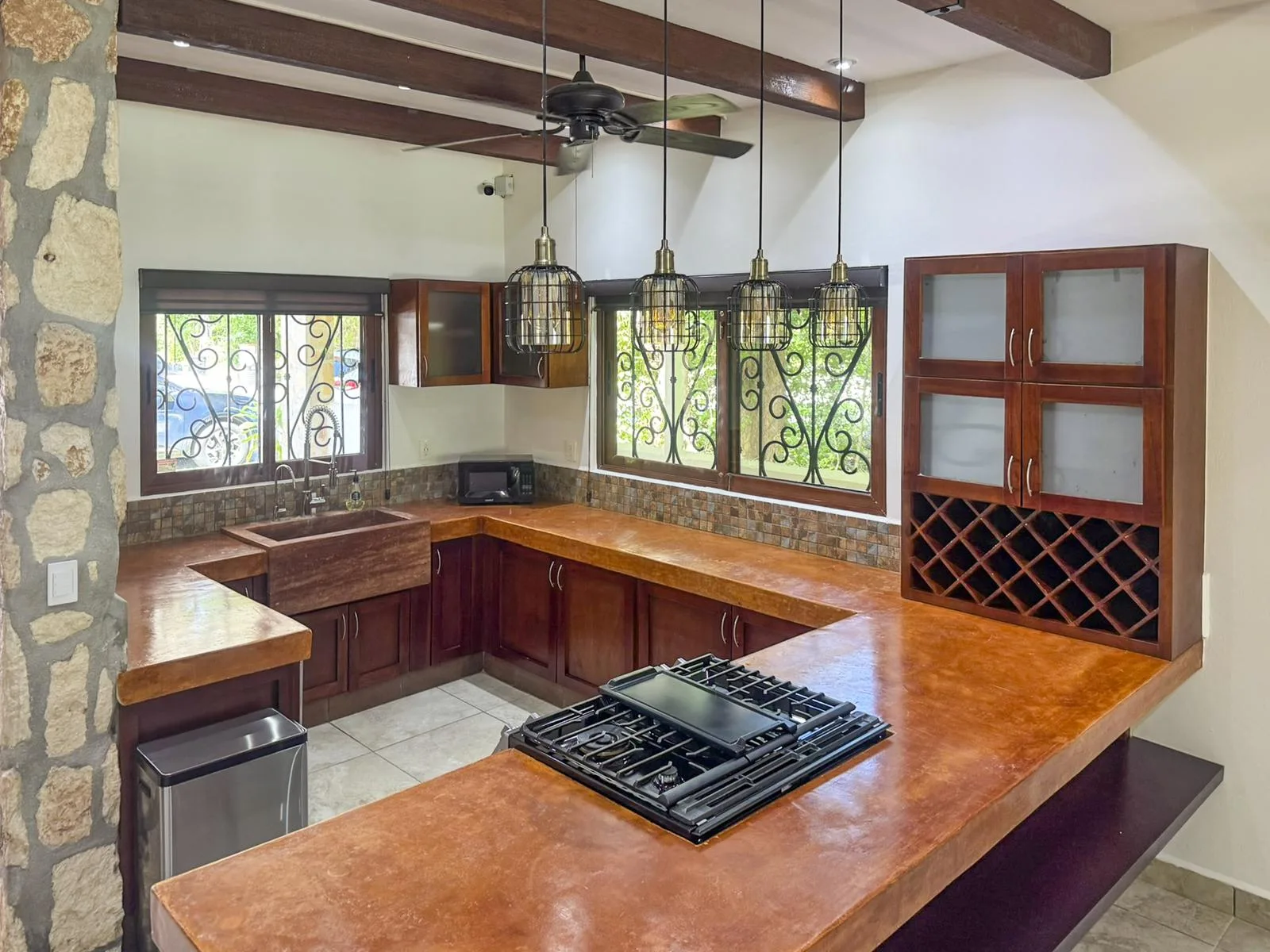 Additional property features include covered parking, a large storage room housing a second refrigerator, a water softener, filters, and a UV purification system. The home has a reverse osmosis system at the kitchen sink and refrigerator, an automatic 18 KW generator with smart power transfer, and two separate gas tanks for the kitchen/grill and the generator. Exterior lighting, pool pump and lights are Wi-Fi controlled. A security camera system and alarm are installed, and ample integrated storage is found throughout the house.
