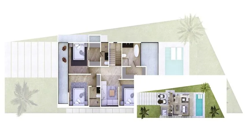 This particular residence offers 407 square meters of construction with open spaces, abundant natural light, and seamless indoor-outdoor flow. The ground floor includes covered parking for two vehicles, a fully equipped kitchen with a breakfast island and marble surfaces, and integrated living and dining areas with floor-to-ceiling windows. A glass atrium with double-height ceilings leads to a large covered terrace with a lounge area and a private swimming pool surrounded by tropical vegetation. Also on this level is a bedroom or study with a walk-in closet and full bathroom, a service room, and a laundry area.