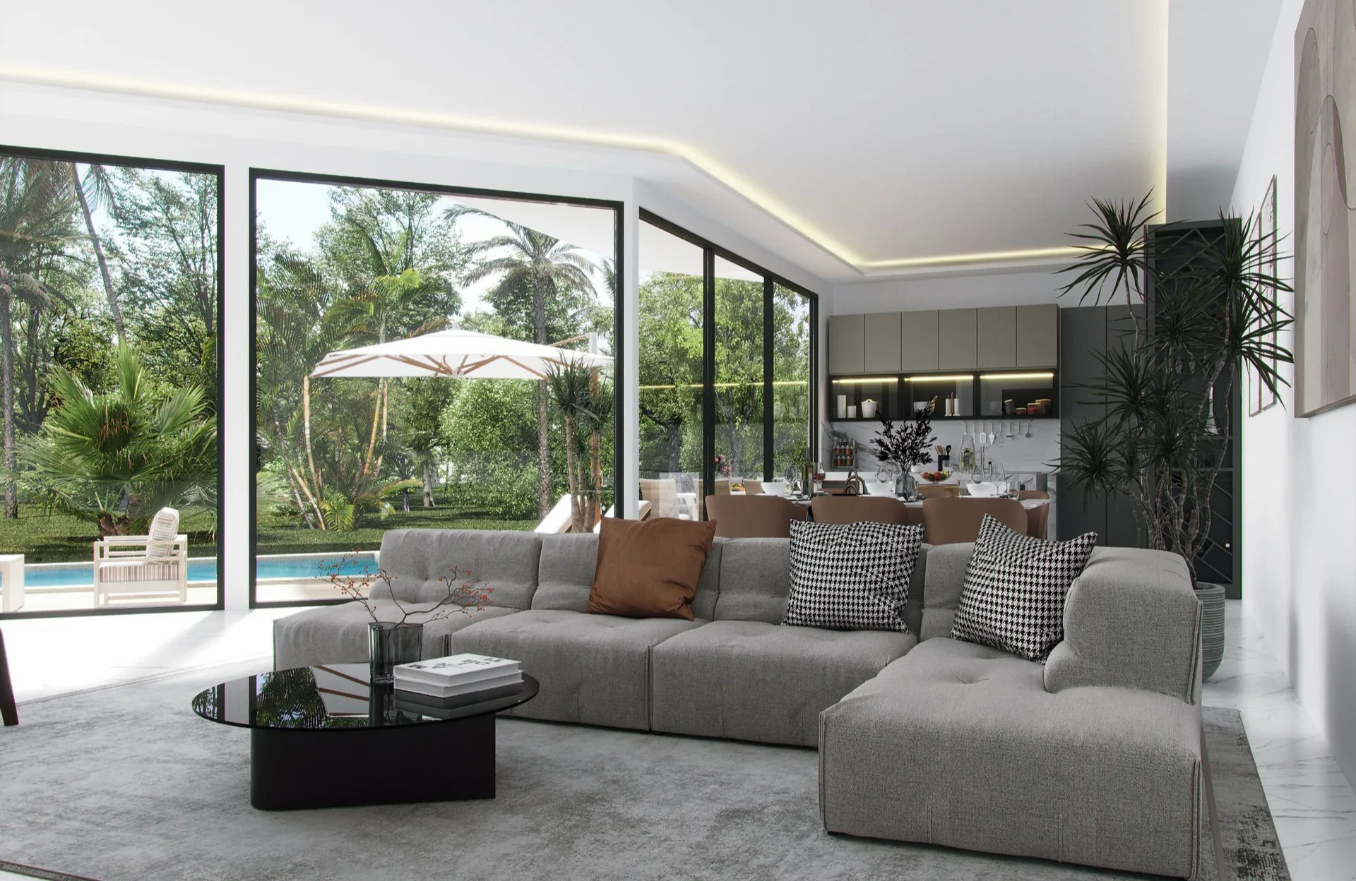 The bright villa is designed to take advantage of natural light and offers panoramic views of the nature preserve. It features a 10-meter-long private swimming pool, private parking for three cars, a service room, and a laundry room.