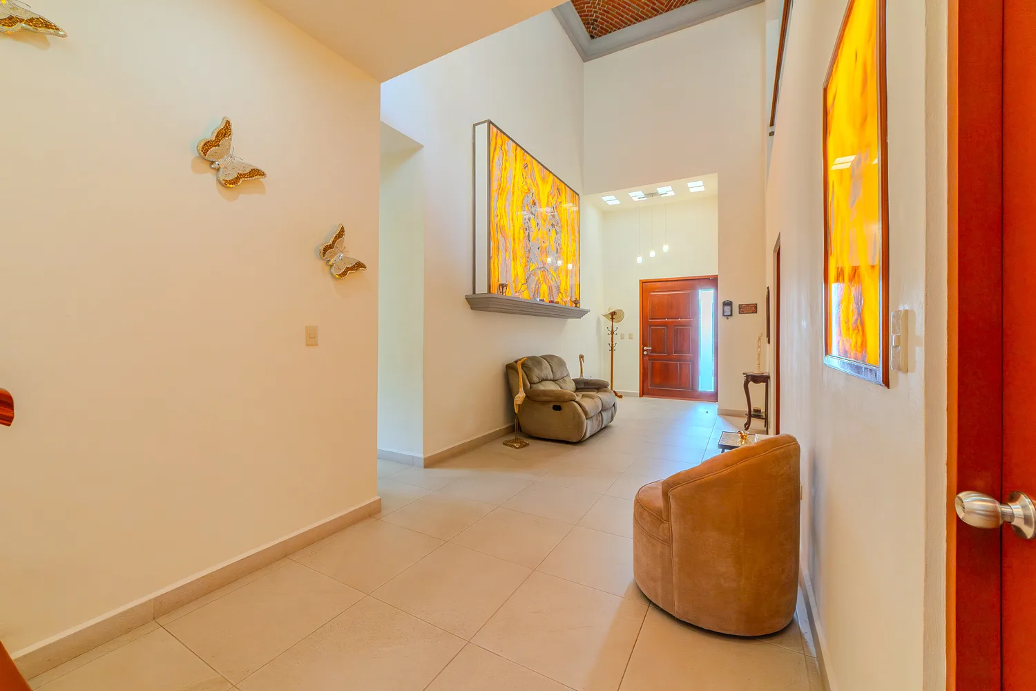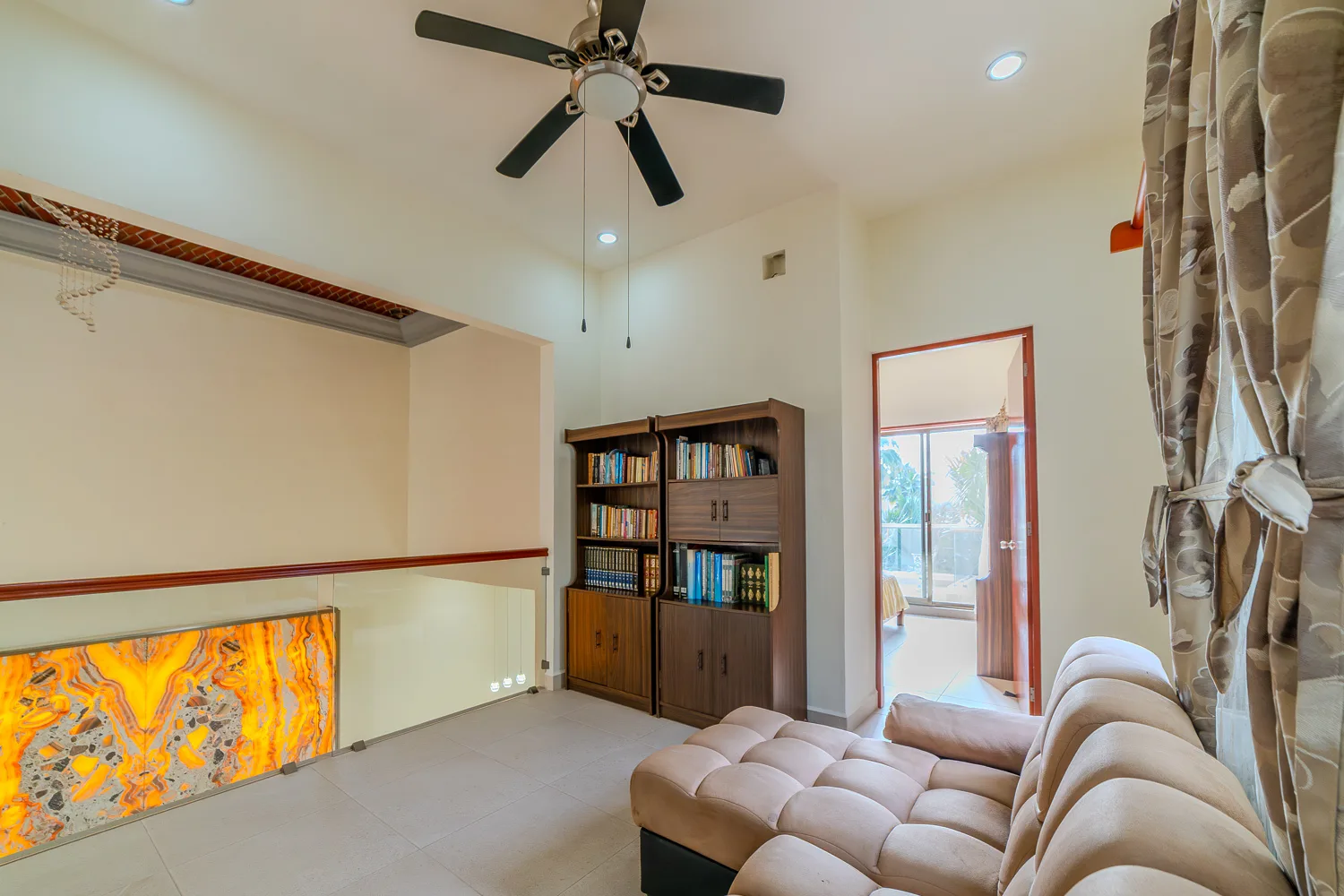 On the second floor, there are two additional bedrooms, each with a private bathroom, a comfortable family room or library, and terraces and balconies with views.