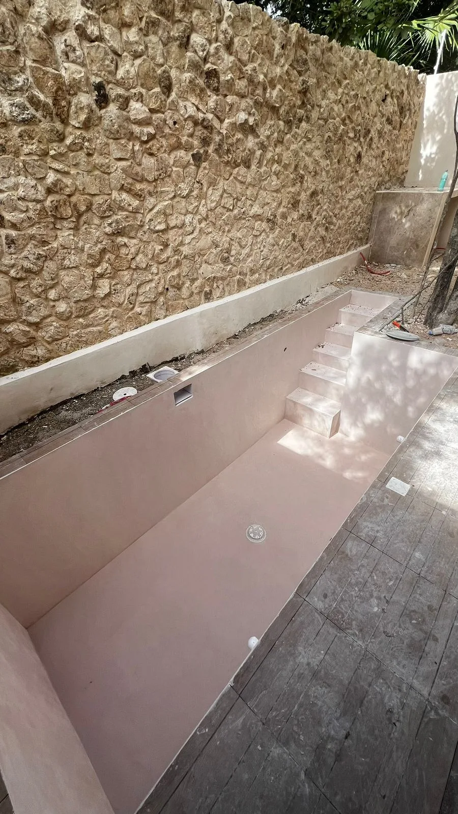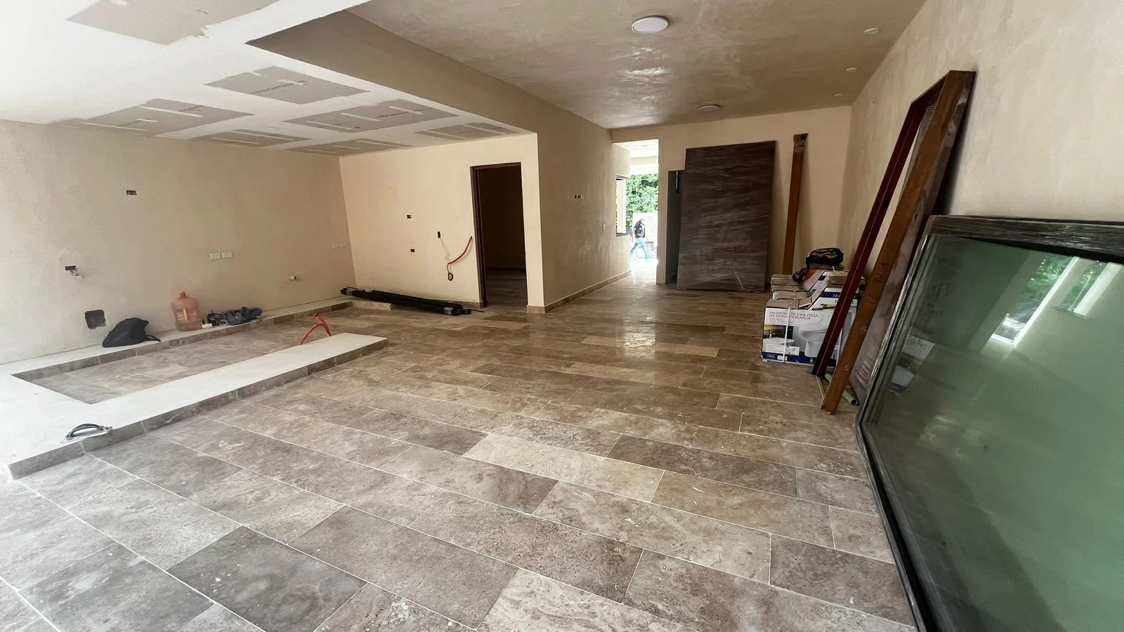 The lot size is 1, 766 square feet with a construction area of 3, 304 square feet. The first floor comprises a living-dining room and an integral kitchen equipped with a granite bar. Also on this level is a bedroom with a full bathroom, a half bathroom for visitors, a storage area, a garden with a private pool, and the two-car parking space.