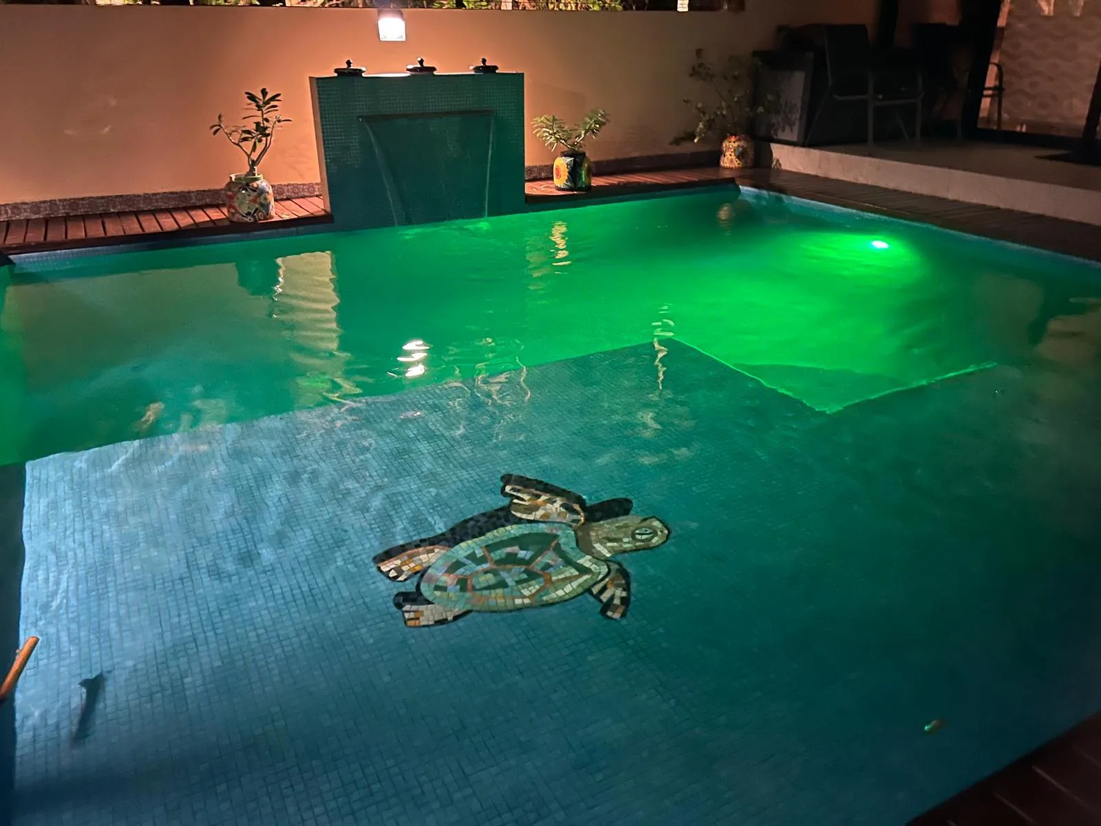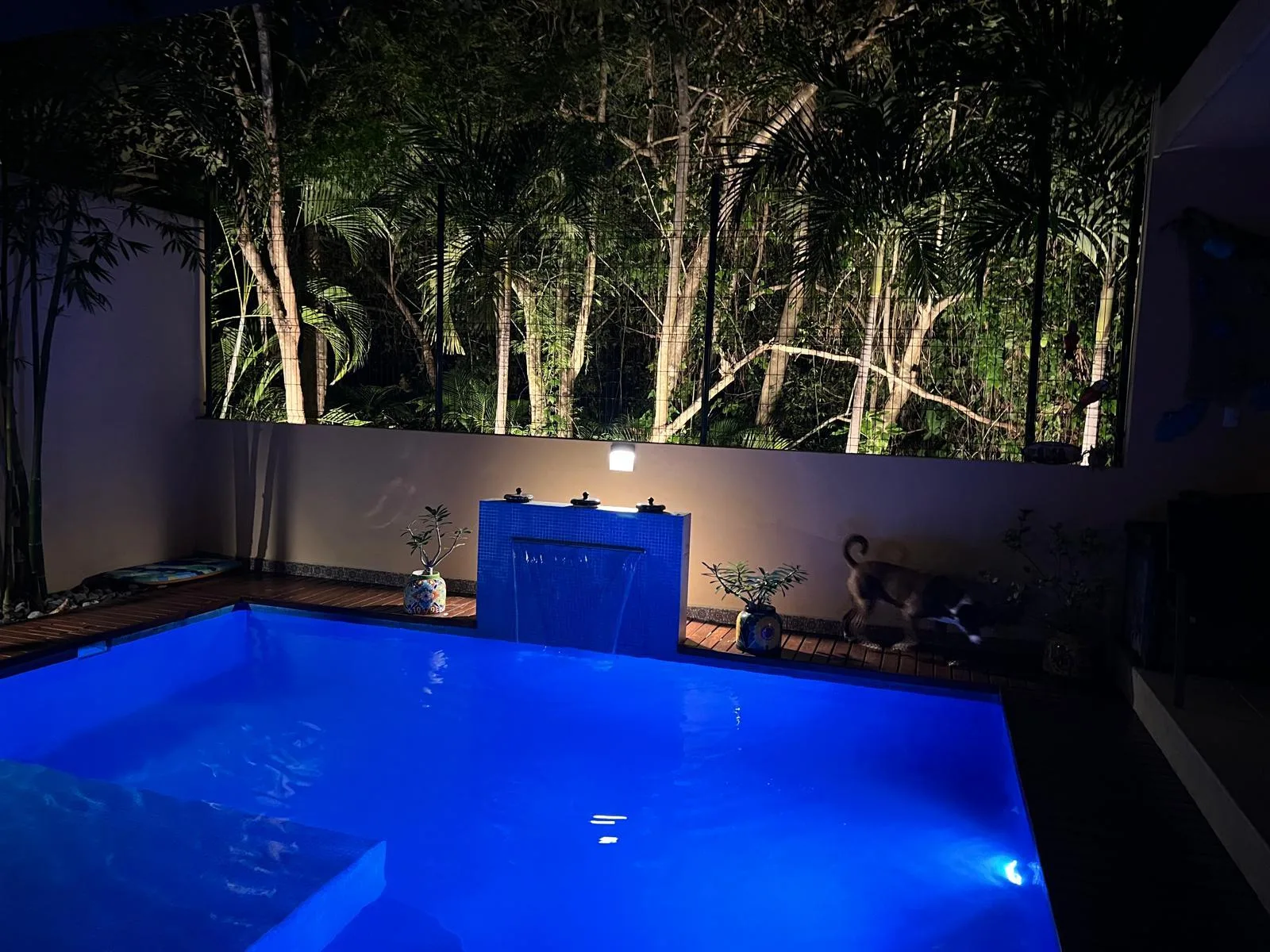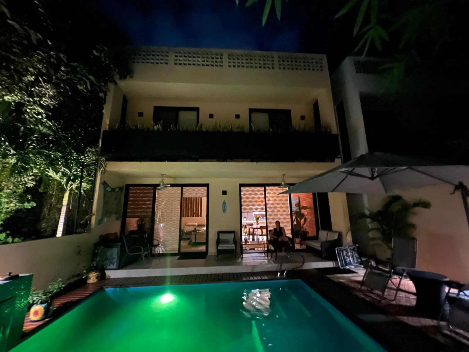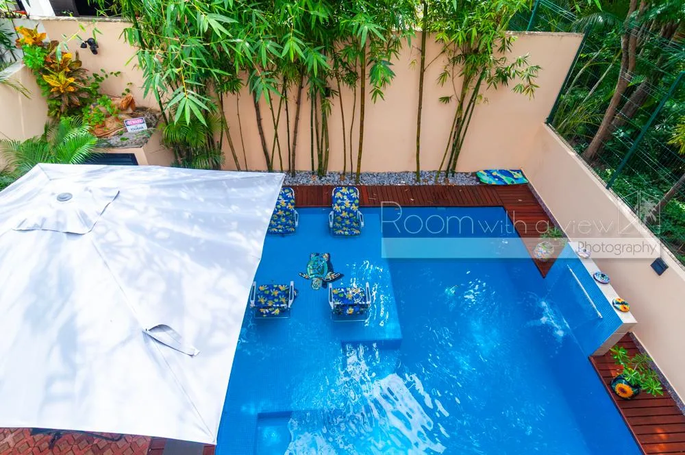 The property opens to a fully walled-in backyard with a covered patio and a private swimming pool. A rooftop terrace provides additional space for relaxation and offers views. The villa also includes a balcony with a jungle view.