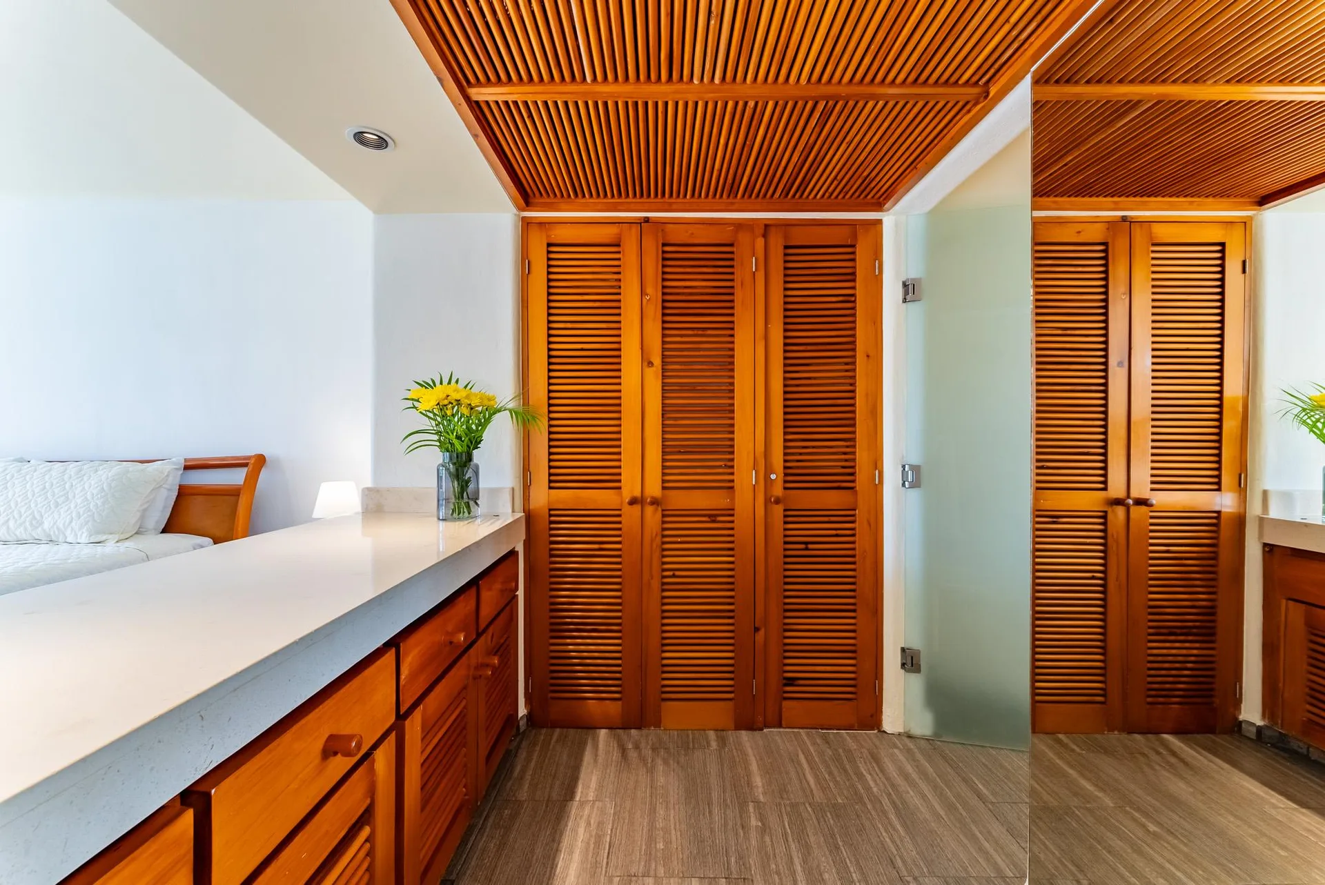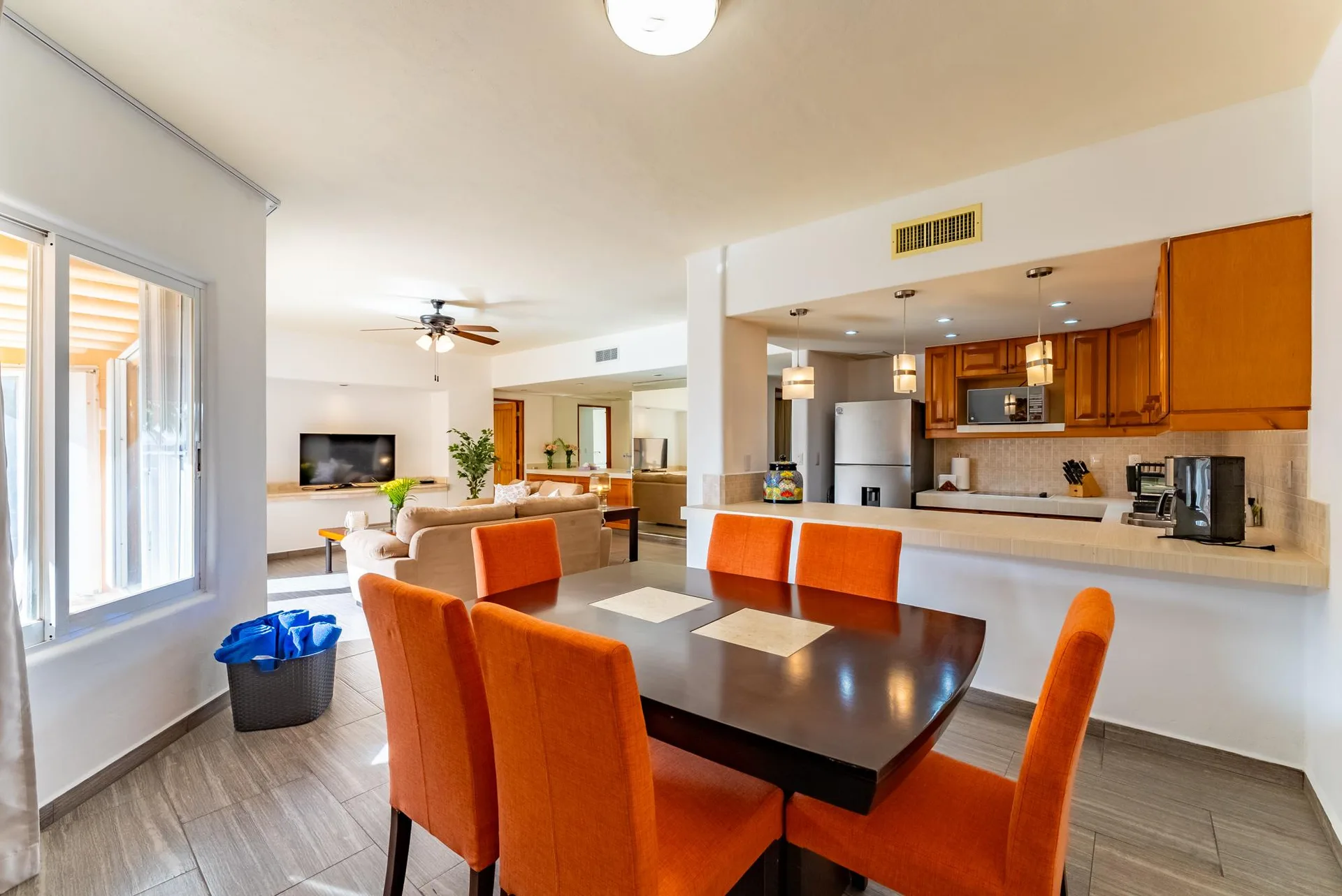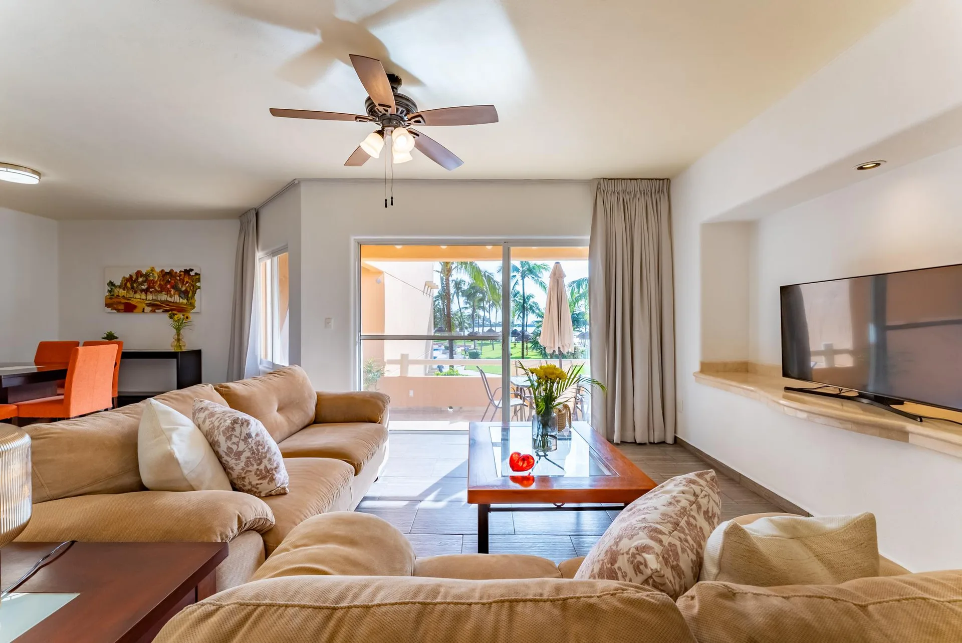 The residence offers an open terrace that facilitates a comfortable indoor-outdoor living experience. The condominium features large common spaces, two large infinity pools, and landscaped gardens.
