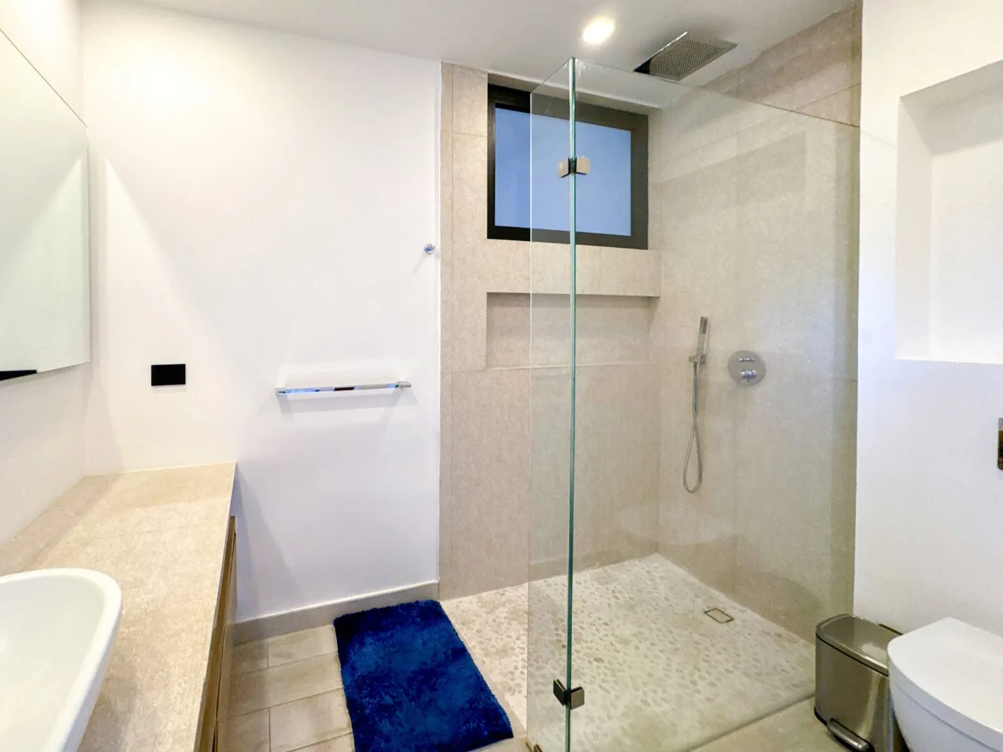 The primary suite upstairs features a private sea-facing terrace and a spa-style ensuite with an ocean-view soaking tub and a separate walk-in shower. The kitchen is equipped with Miele appliances, porcelain countertops, custom soft-close cabinetry, and an osmosis water filtration system. Polished marble or porcelain flooring and warm wood accents are found throughout.