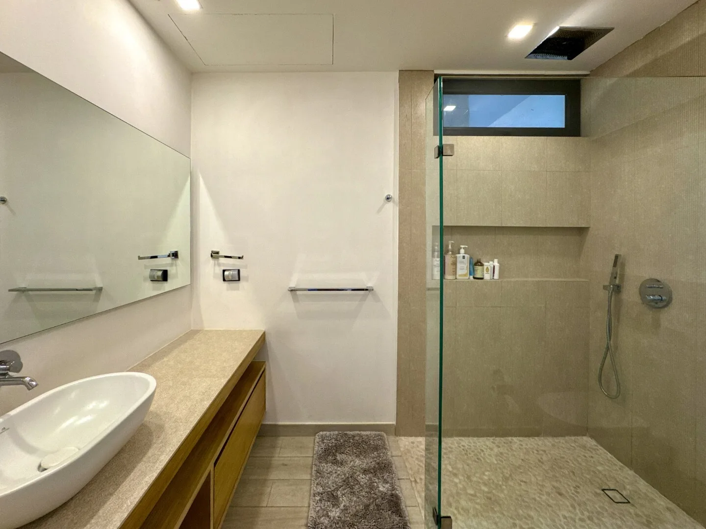 There are three spacious bedrooms, each with its own ensuite bathroom, outdoor space, and generous storage. One bedroom is on the ground level with garden views. The residence includes 3. 5 bathrooms in total, plus a dedicated office or media room with a queen Murphy bed for flexible use.