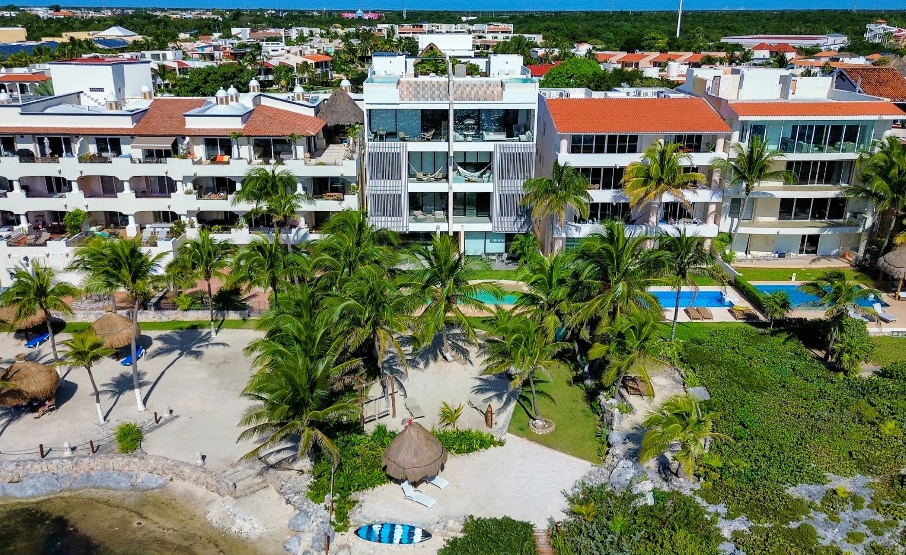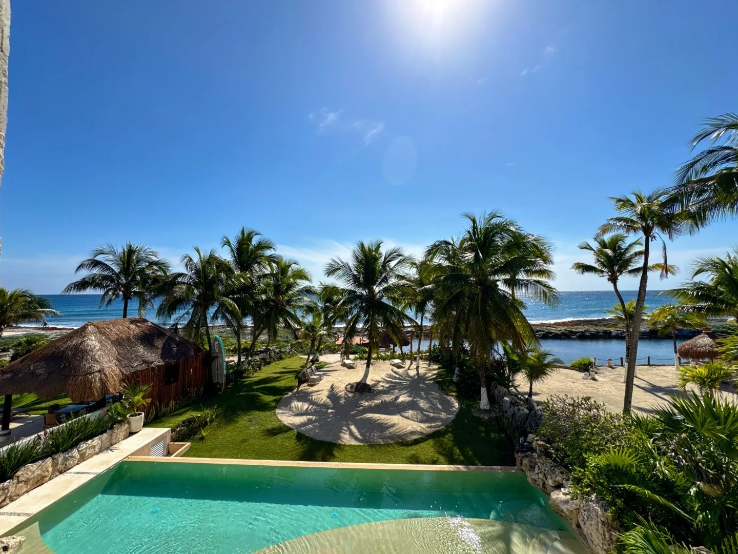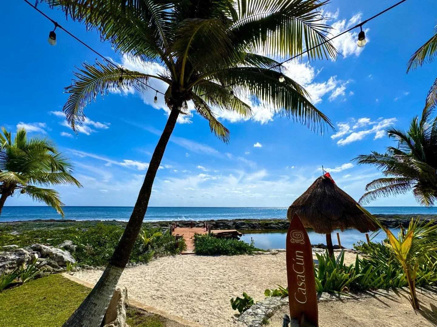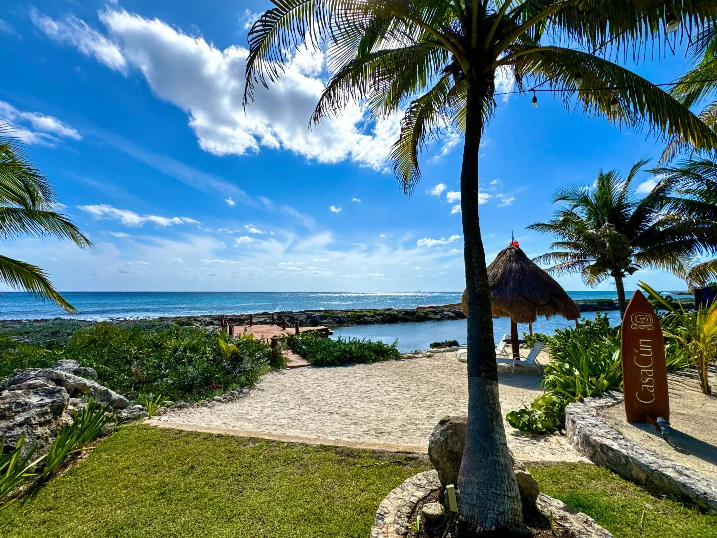 This beachfront residence is set in Puerto Aventuras, positioned between the Caribbean Sea and a calm lagoon. It offers uninterrupted water views and direct access to both the open sea and a protected, swimmable shoreline.