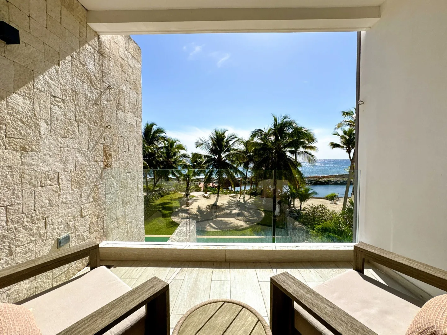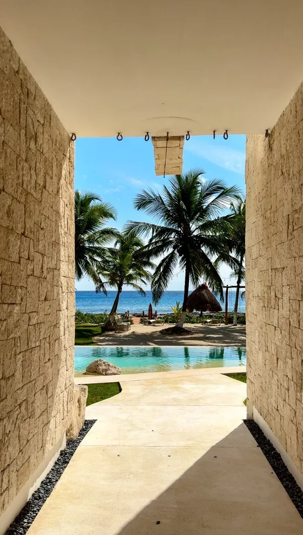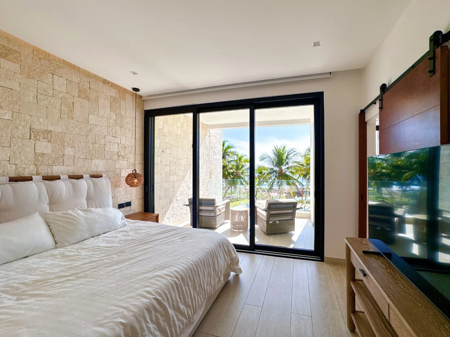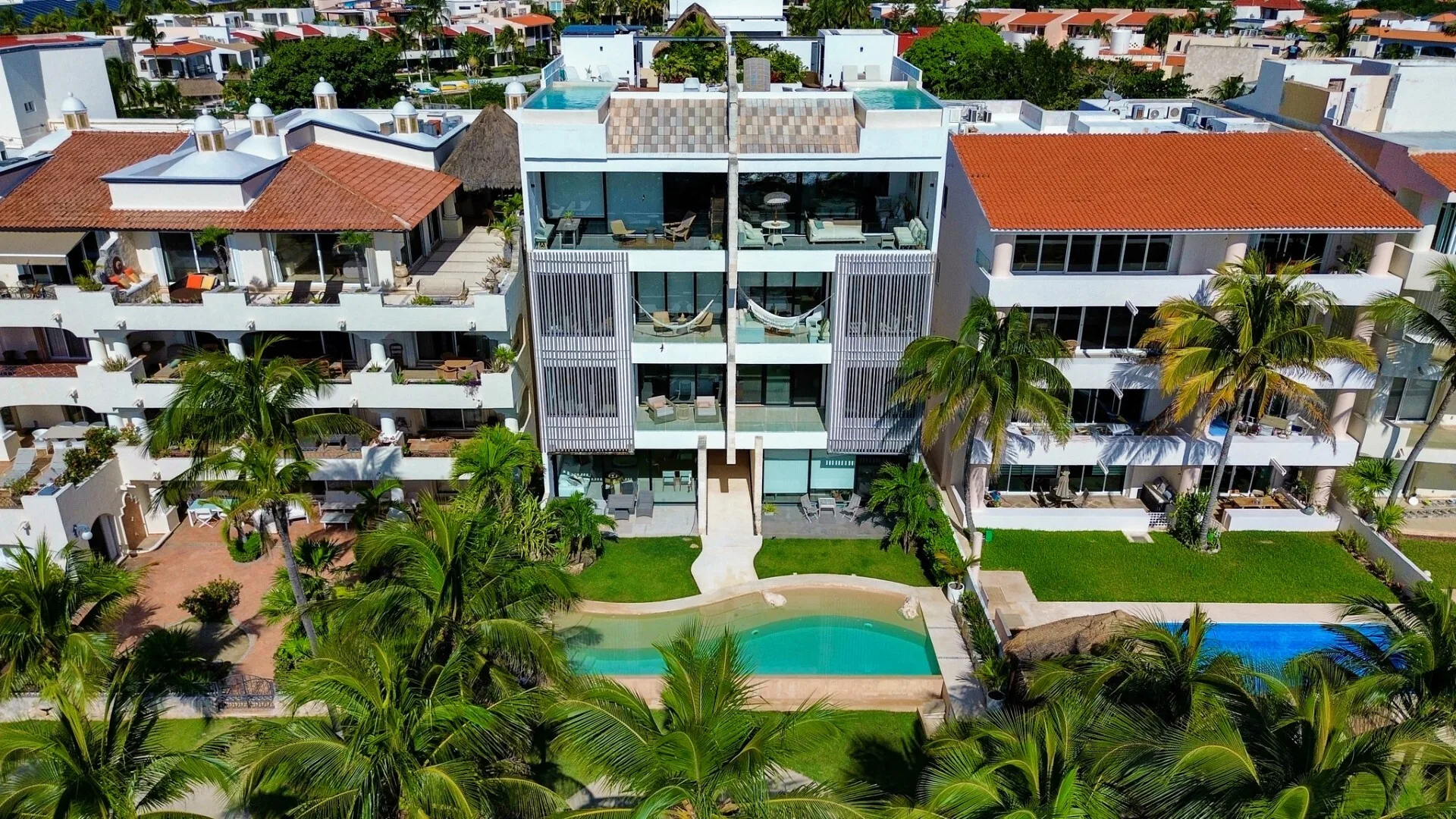 This beachfront residence is set in Puerto Aventuras, positioned between the Caribbean Sea and a calm lagoon. It offers uninterrupted water views and direct access to both the open sea and a protected, swimmable shoreline.