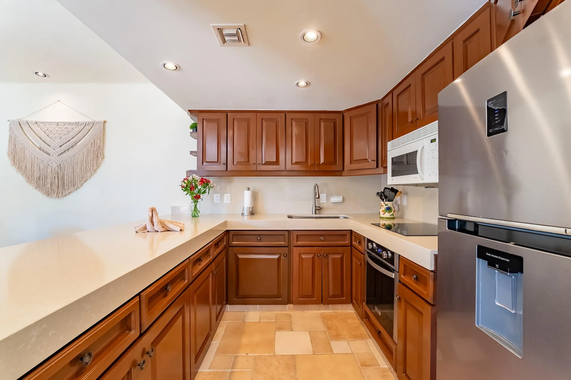 The unit features a private terrace overlooking the brilliant Caribbean Sea. Inside, you will find two spacious primary bedrooms, each with a king-size bed. The modern open floor plan includes a fully equipped kitchen, dining area, and comfortable living room, all designed to capture the sea breeze and ocean views.