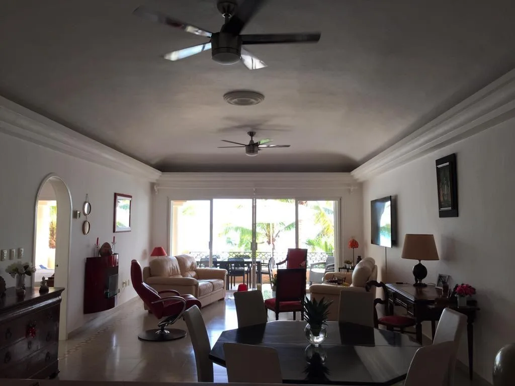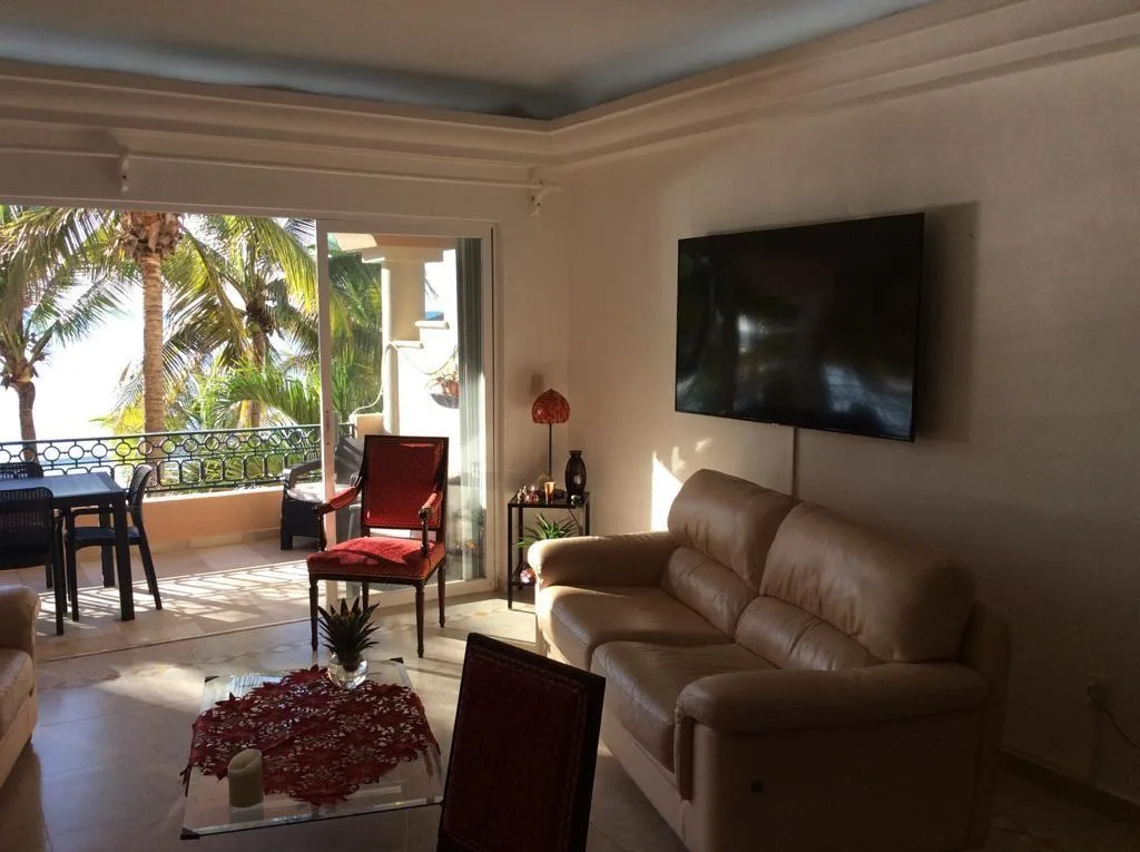 This sea-front apartment in Puerto Aventuras offers expansive views of the turquoise sea and benefits from the warm coastal breeze. The property provides a tranquil living environment integrated with the natural surroundings of the Mexican Caribbean.
