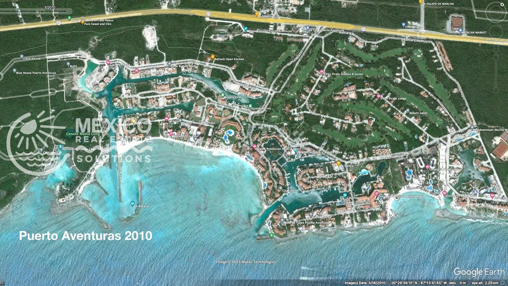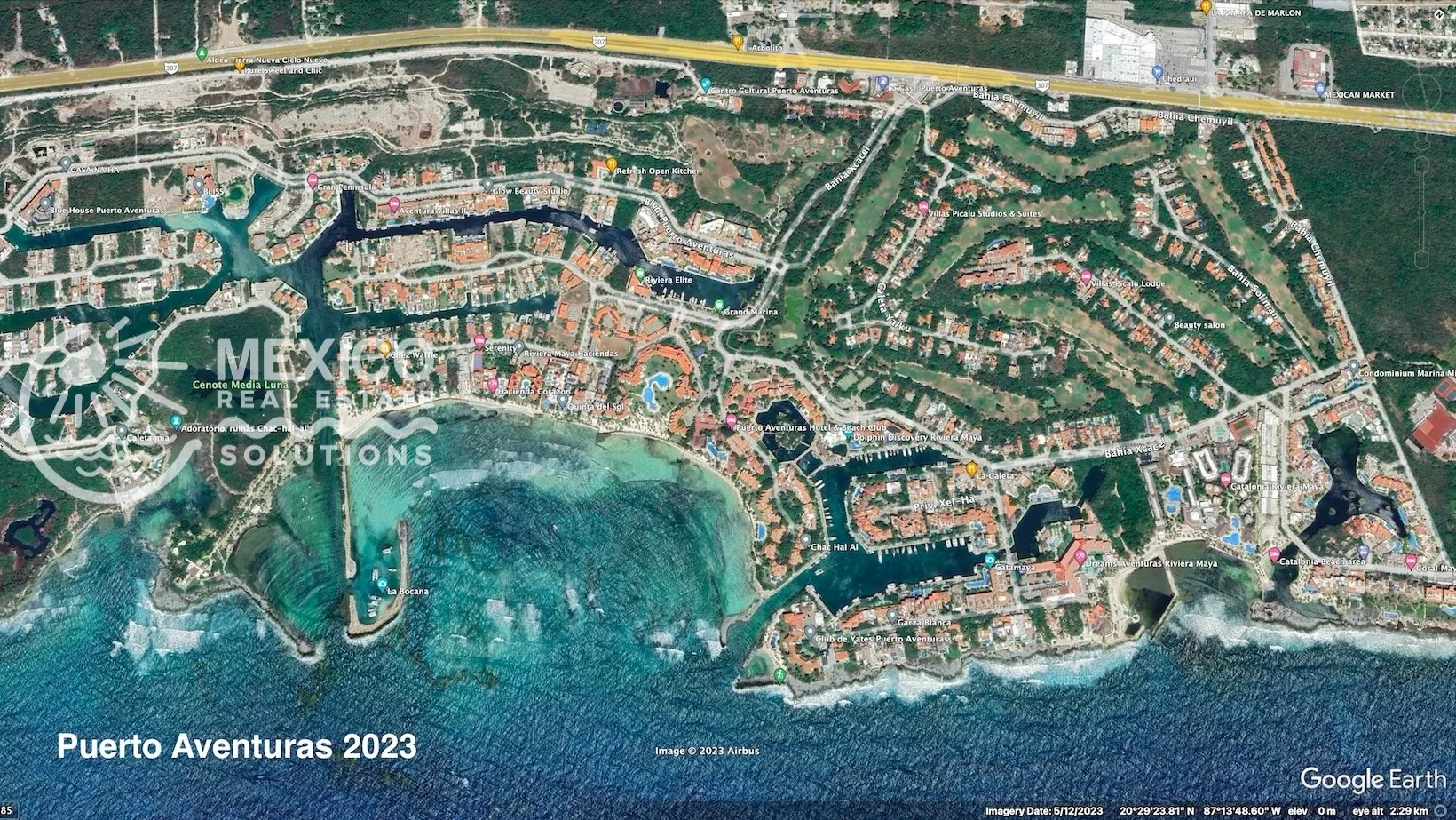 Puerto Aventuras is located between Playa del Carmen and Tulum. It offers gated security, a full-service marina, beaches, dining, and access to outdoor adventures such as cenotes, eco-parks, and scuba diving.