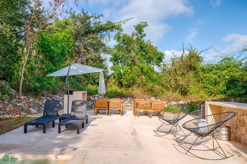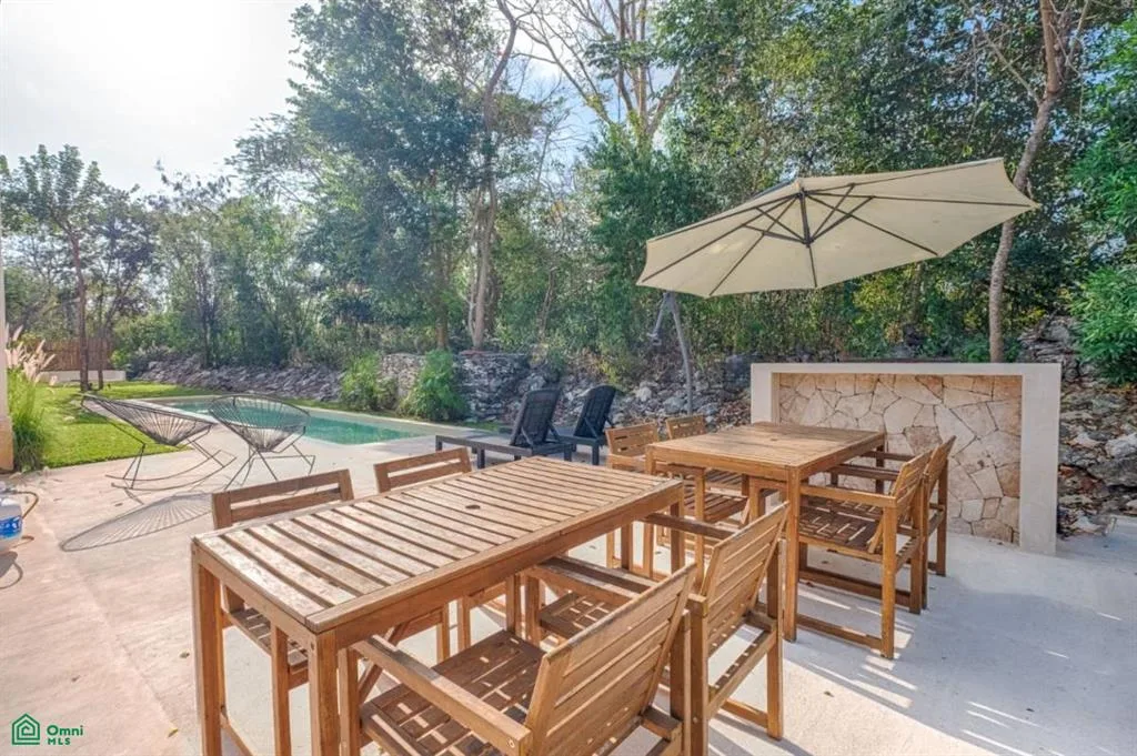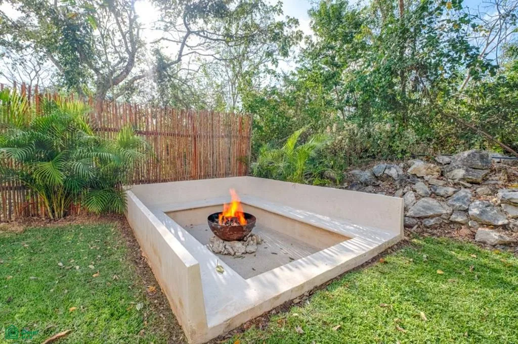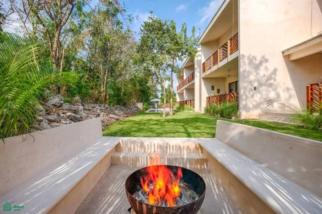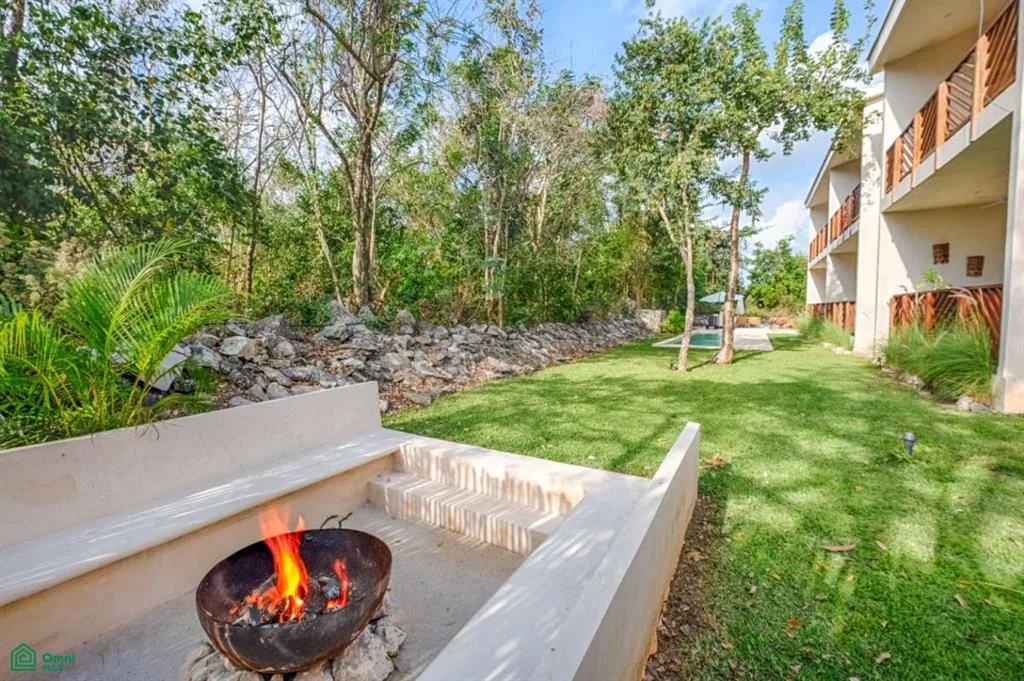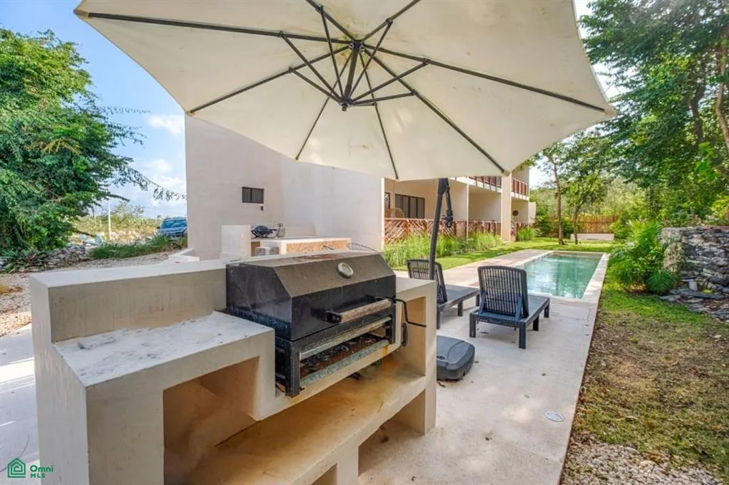 The property offers views of the pool and jungle, a covered terrace, and a built-in barbecue grill and fireplace. It includes a designated parking space. The community is gated with 24/7 access.