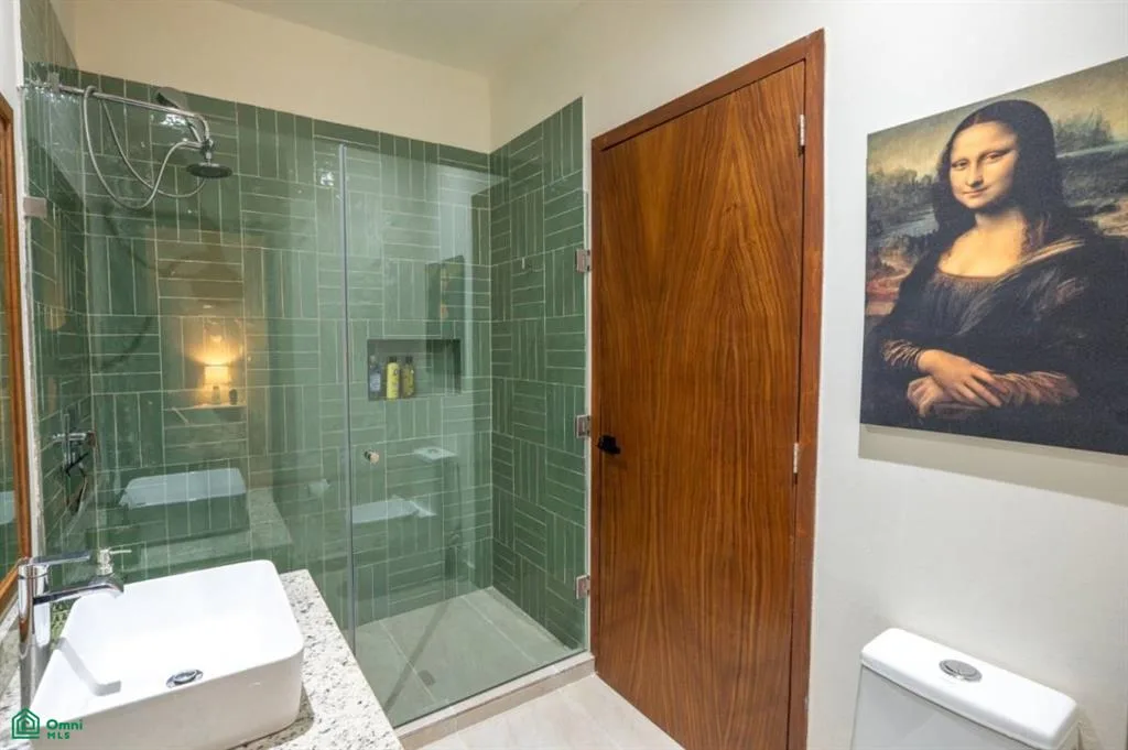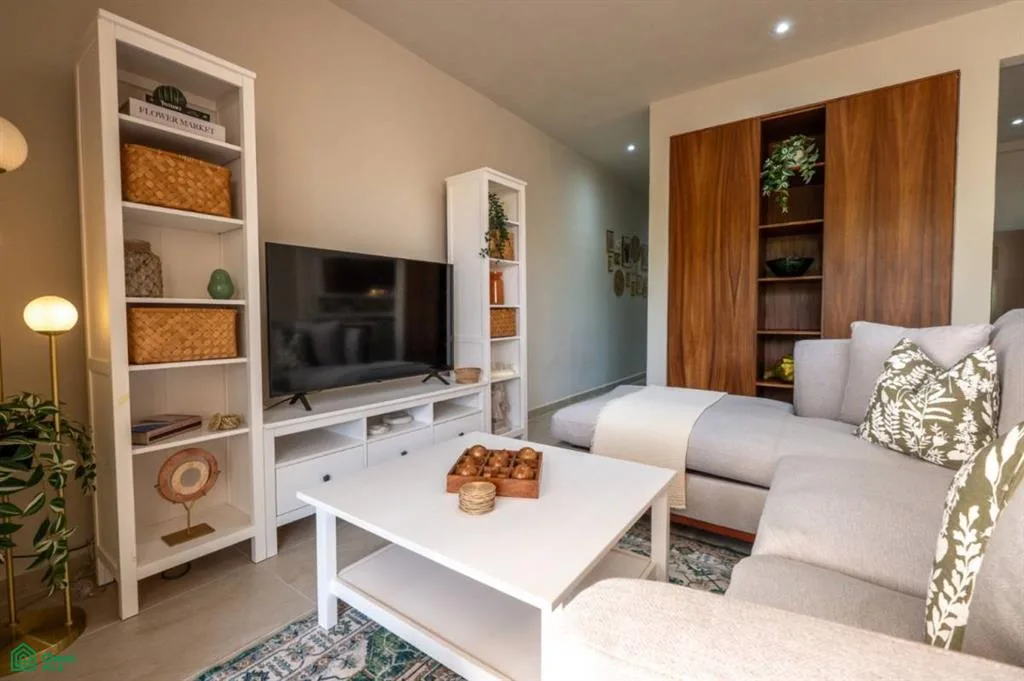 The interior is bright and airy, with a seamless flow from the living and dining area to the terrace and the shared swimming pool. Modern finishes and natural textures create a relaxed, coastal atmosphere, while tasteful decor adds warmth and character. The two full bathrooms have elegant walk-in showers, and a lockable room provides added flexibility for guests or rental use.