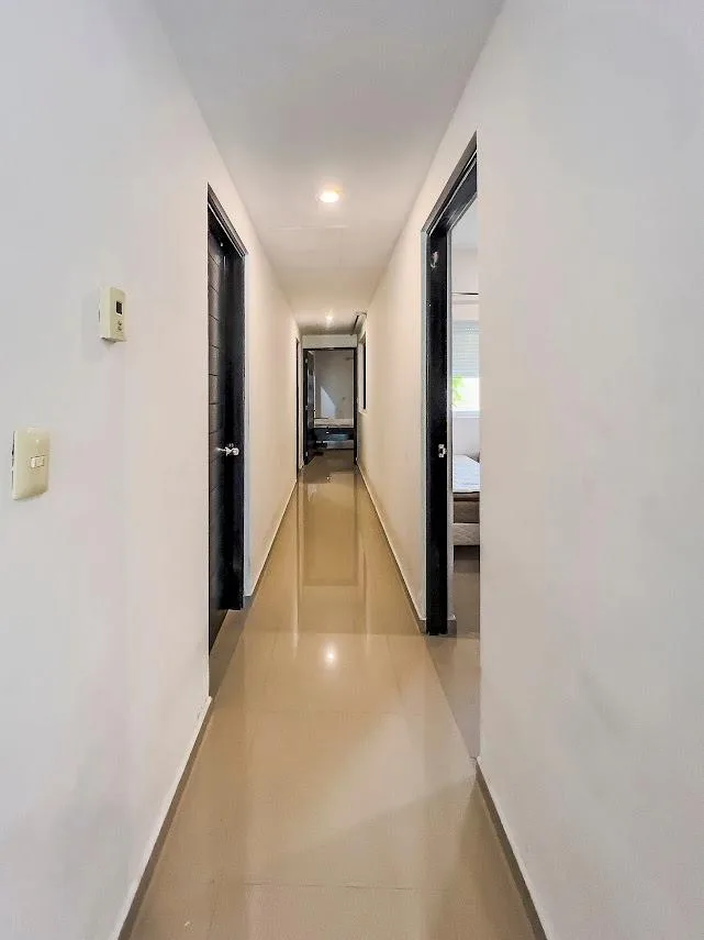 The master bedroom includes a private bathroom, a wooden closet, and electric blinds. The secondary bedroom has a wooden closet and access to a shared bathroom. A full bathroom with a bidet is present, along with a laundry area containing a washer, an electric water heater, and a laundry sink. There is also a ventilated space measuring 1x1 meters, suitable for an interior garden or additional storage.