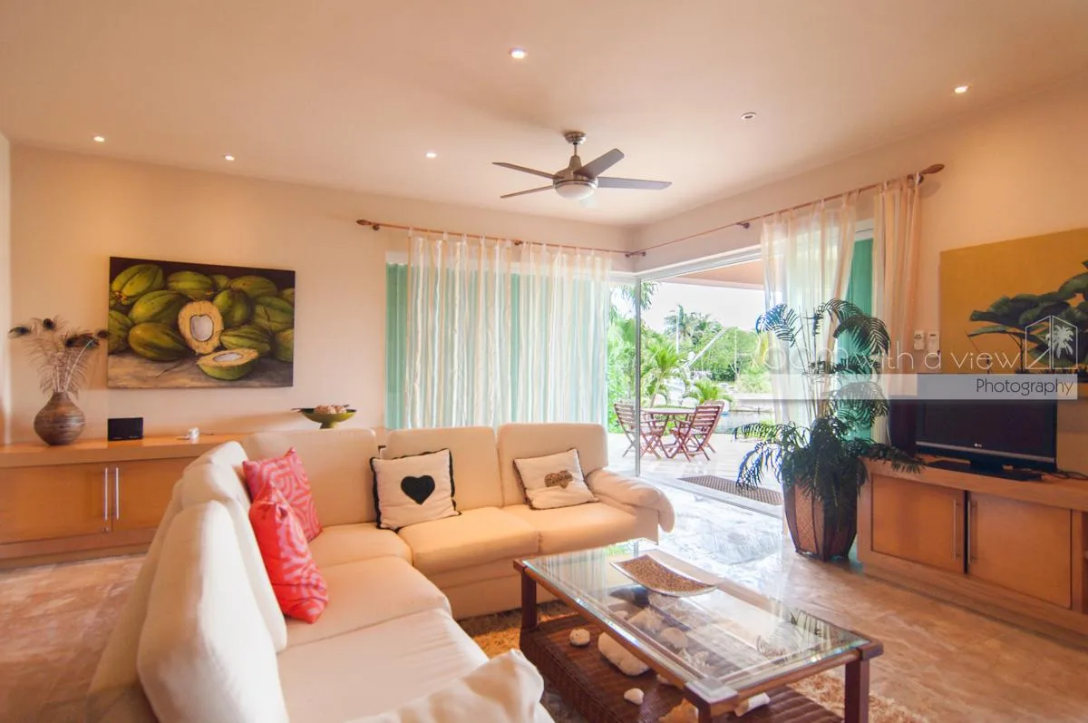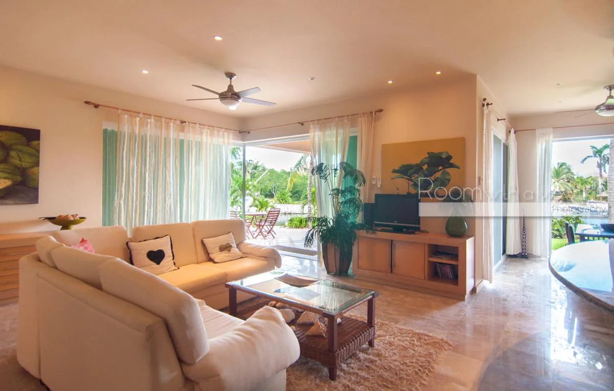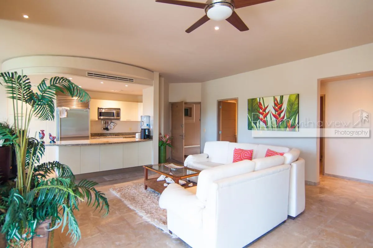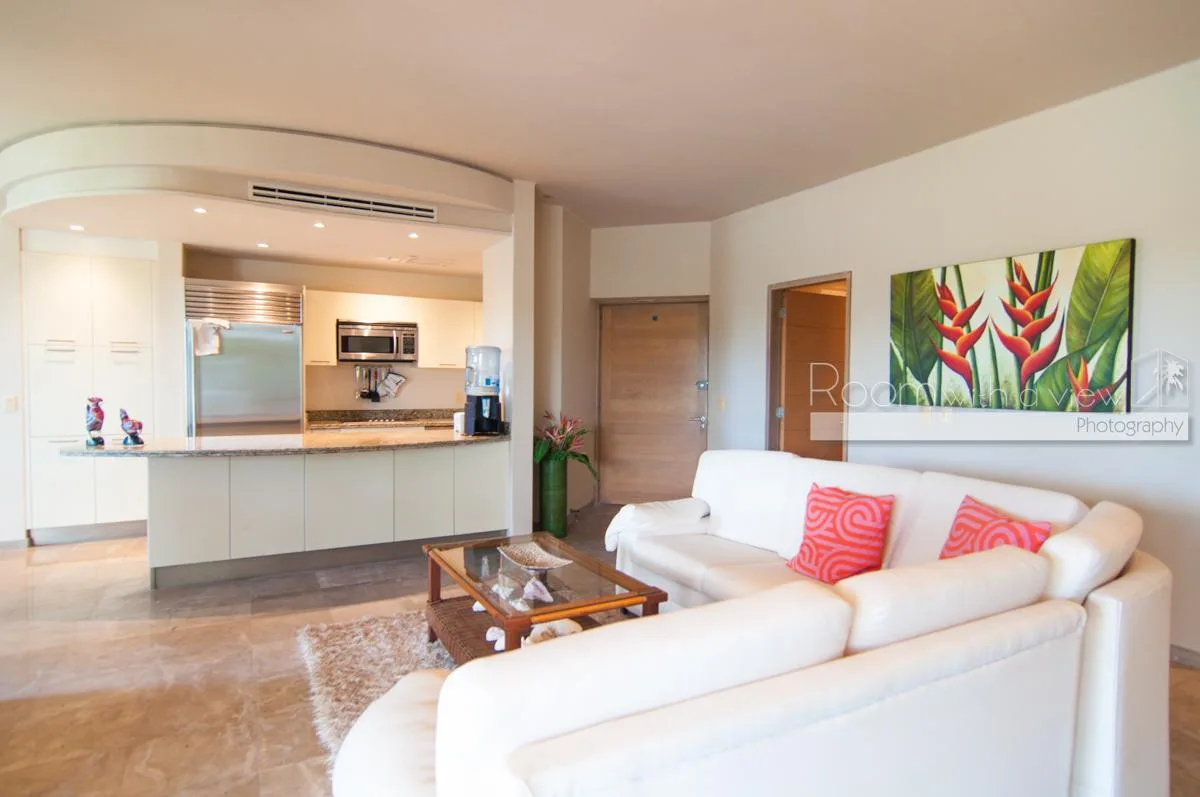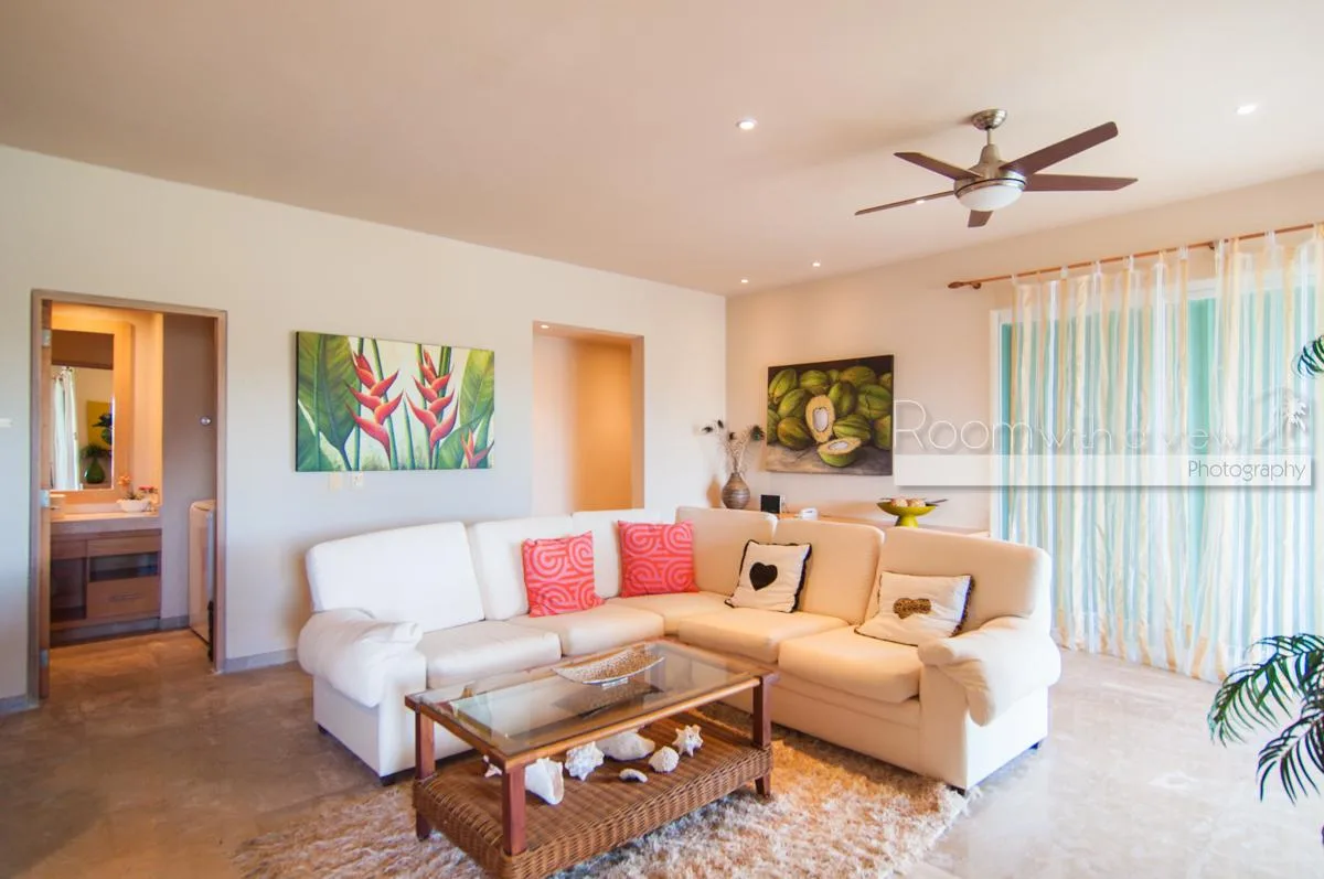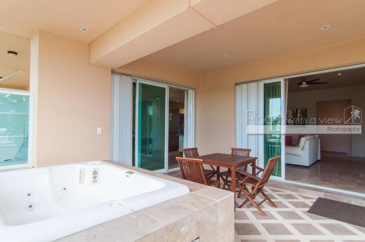 The two-bedroom residence features a spacious open floor plan that receives abundant Caribbean sunlight. The kitchen is equipped with modern appliances and includes a breakfast bar. The living area opens onto a large outdoor terrace that contains a Jacuzzi.
