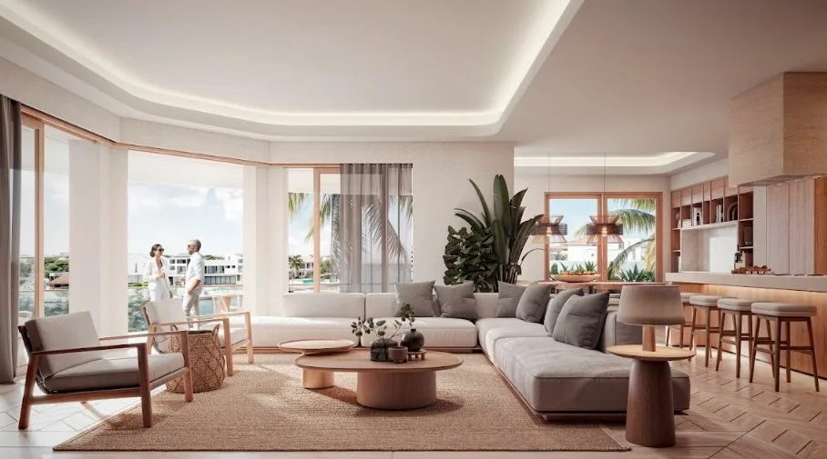 Inspired by nautical life, the design features cantilevered terraces and fine wood finishes. The development is situated within a secure gated community with 24-hour security.