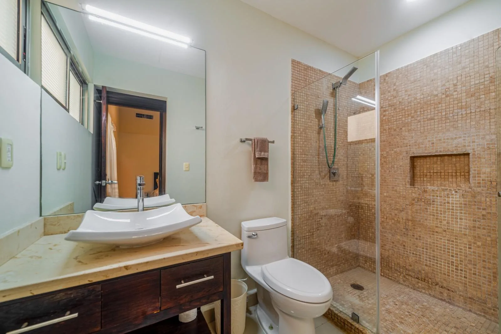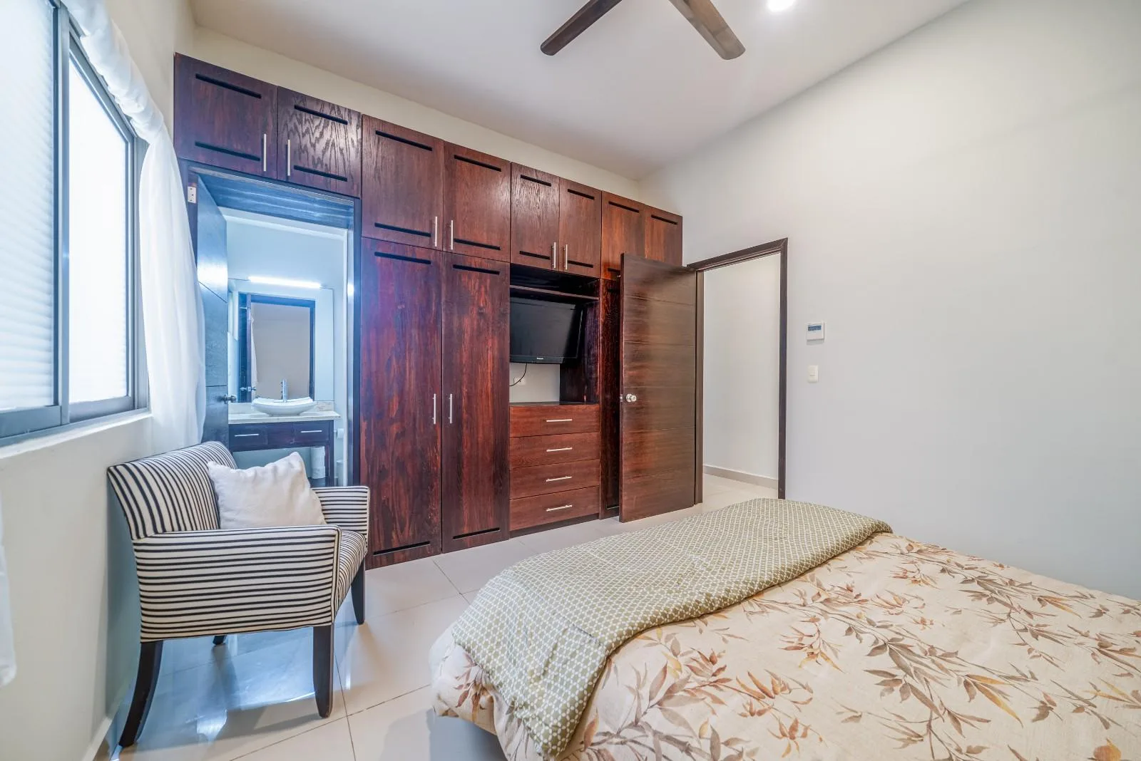 The residence features two bedrooms, each with a private bathroom. A generous open-plan layout combines the living, dining, and kitchen areas, ideal for relaxation and entertaining. A large private terrace provides lush views of the pool, gardens, and the fairways of the Puerto Aventuras golf course.