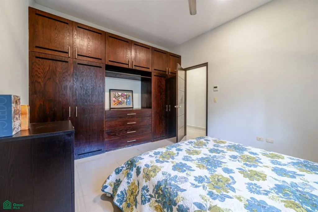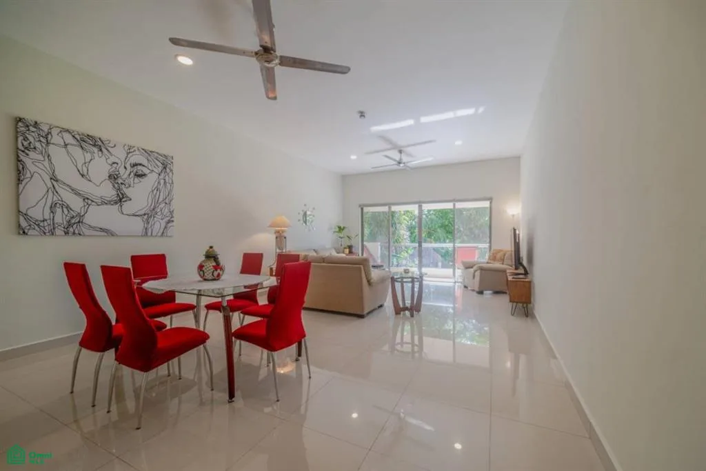 The residence features two bedrooms, each with a private bathroom. A generous open-plan layout combines the living, dining, and kitchen area, ideal for relaxation or entertaining. A large private terrace provides lush views of the pool, gardens, and the fairways of the Puerto Aventuras golf course.