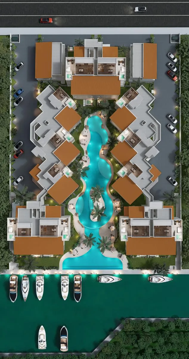 Amenities include an extensive pool with islands and artificial beaches, access to a beach club, and a location facing the marina.