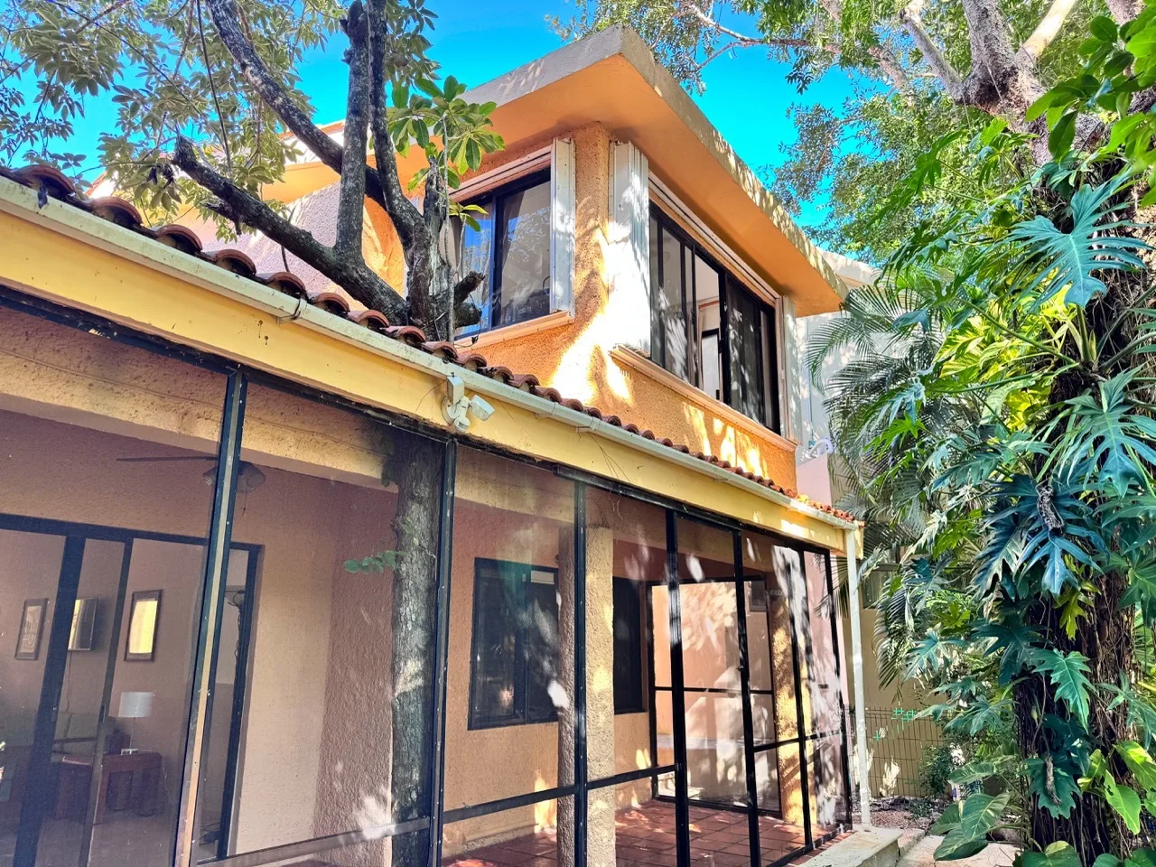 The home includes a service quarters area with a kitchenette. The ground floor contains two bedrooms, while the private master suite is situated upstairs. The living spaces are defined, with an enclosed kitchen and a screened terrace.