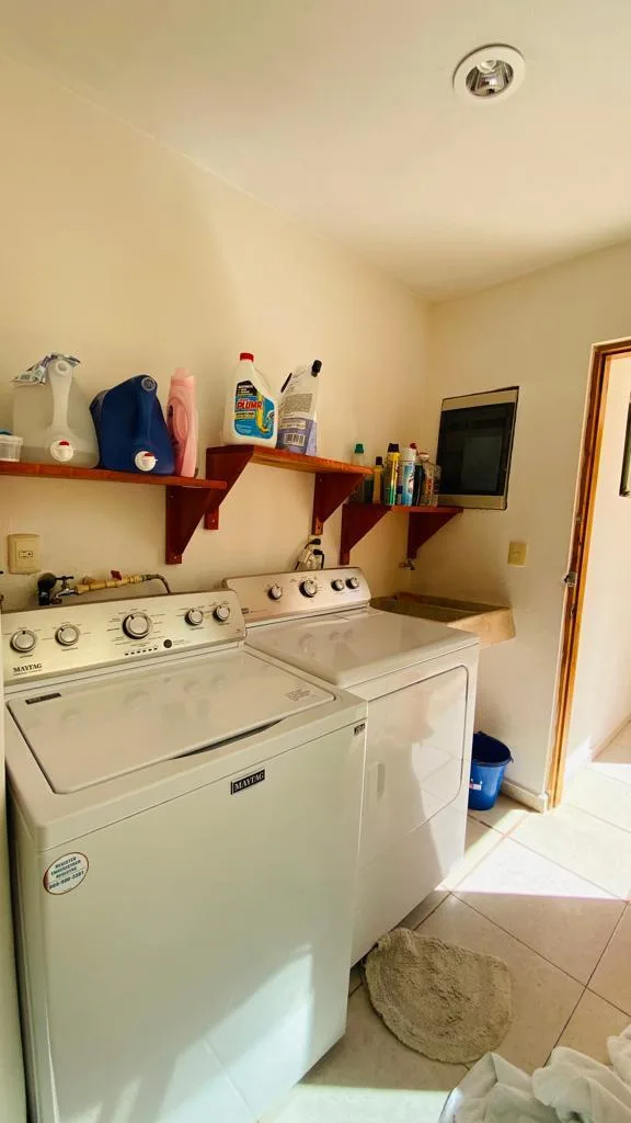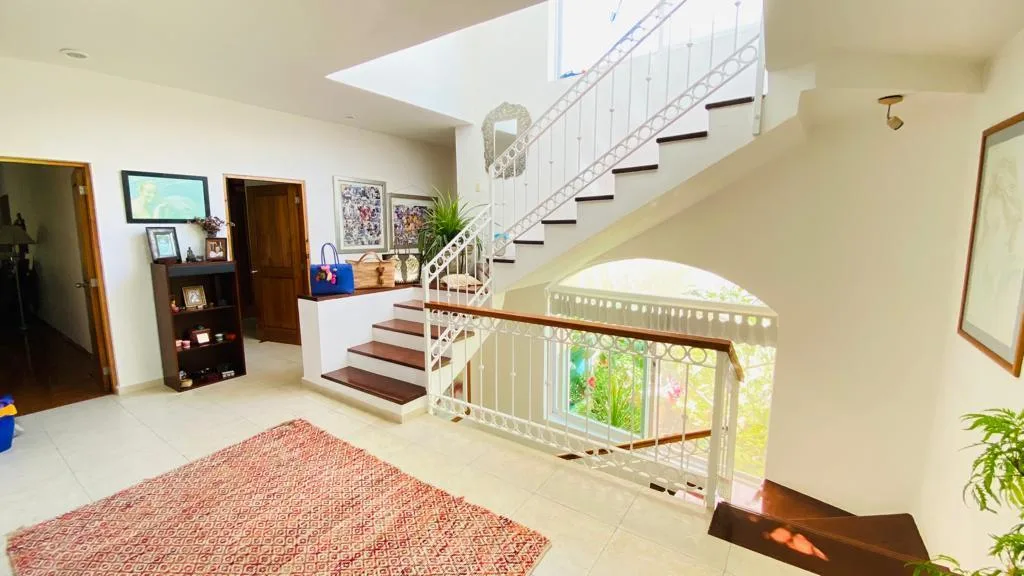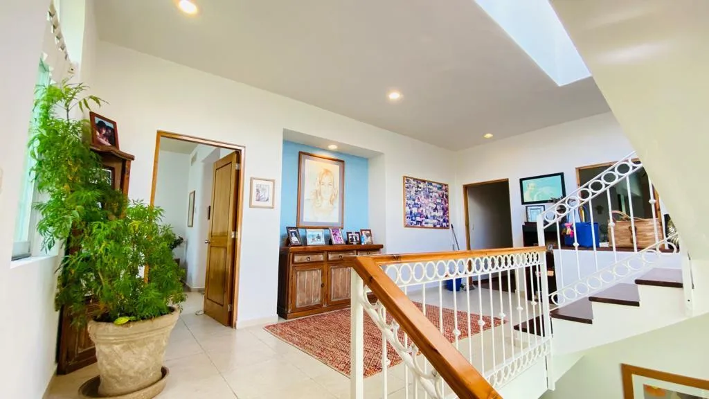 An internal staircase connects the ground floor, upper floor, and the rooftop solarium, which is integrated with the first-level lobby. An independent office or guest house is located above the garage, with private access from the main home, containing three living spaces and a full bathroom. A service room with its own bathroom is integrated with the service patio.